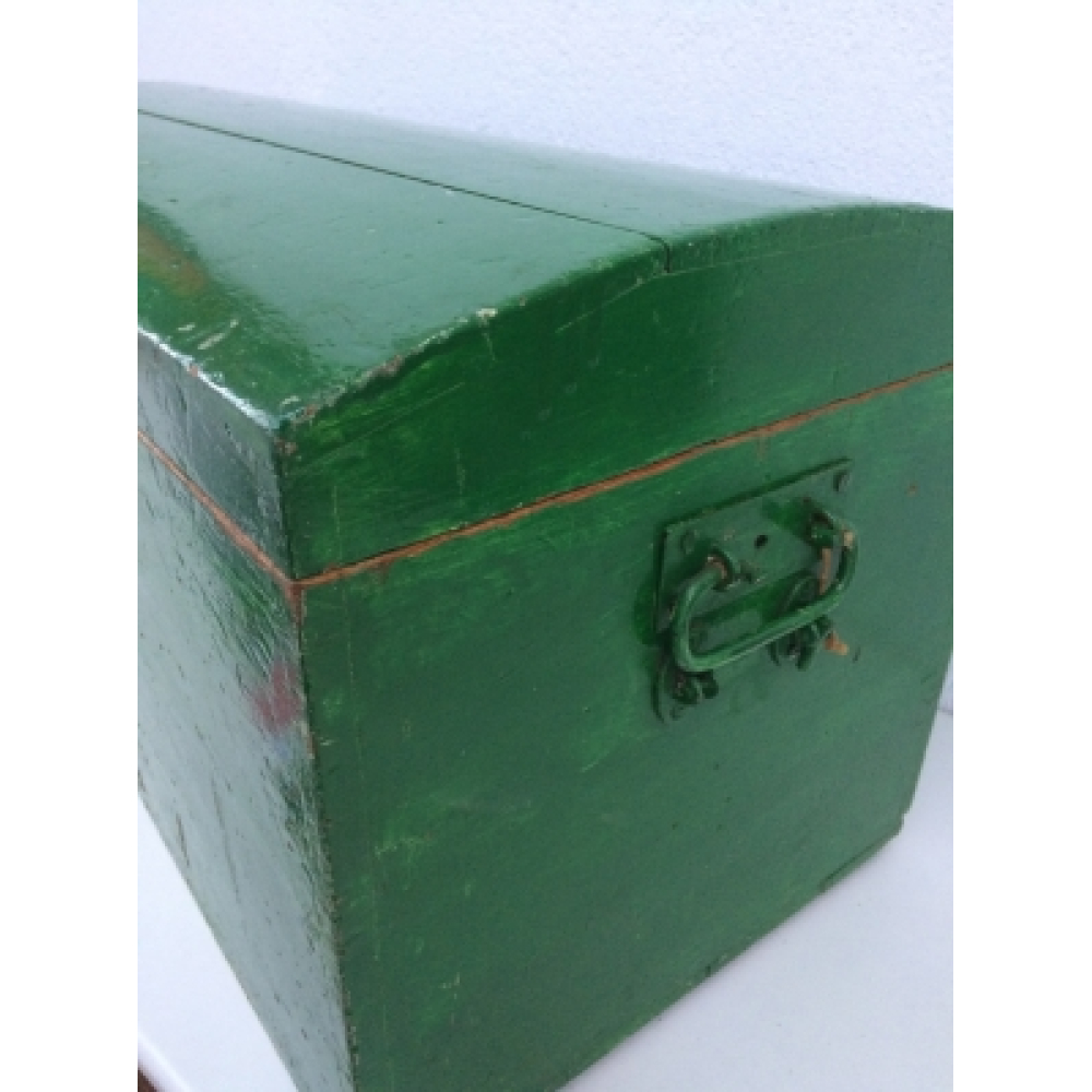 Vintage houten dekenkist met ijzeren hang- en sluitwerk, een groene kleur en een prachtige uitstraling! Ideaal voor in de huiskamer of kinderkamer, om in één keer alle speelgoed in kwijt te kunnen. De afmetingen van deze speelgoedkist zijn
