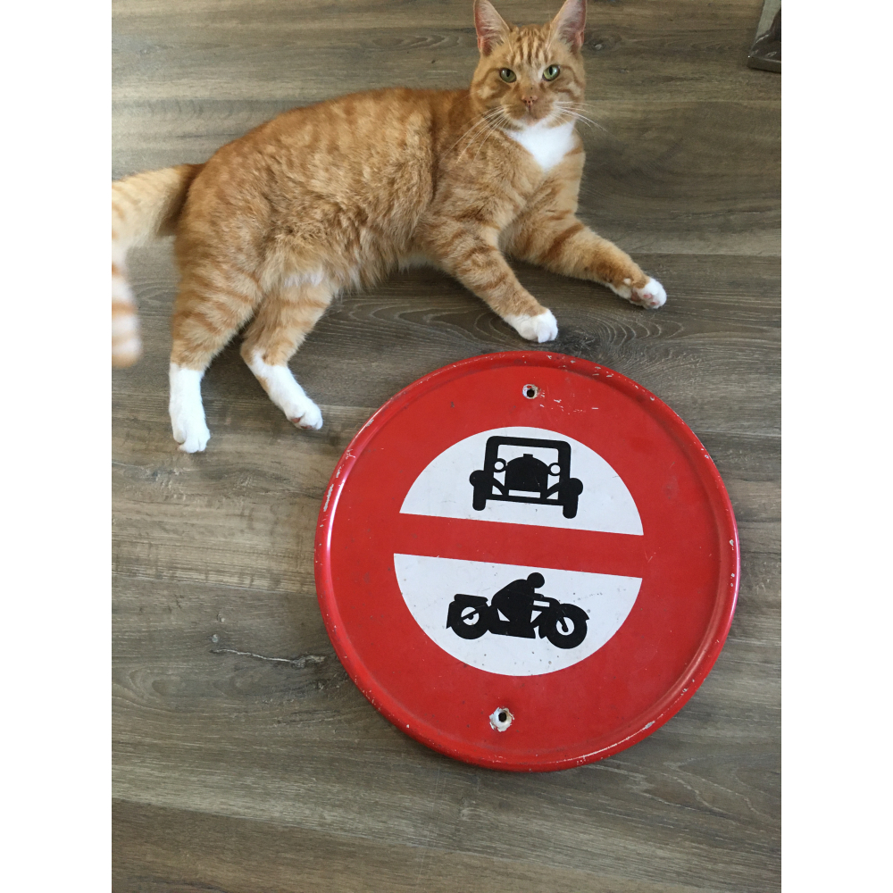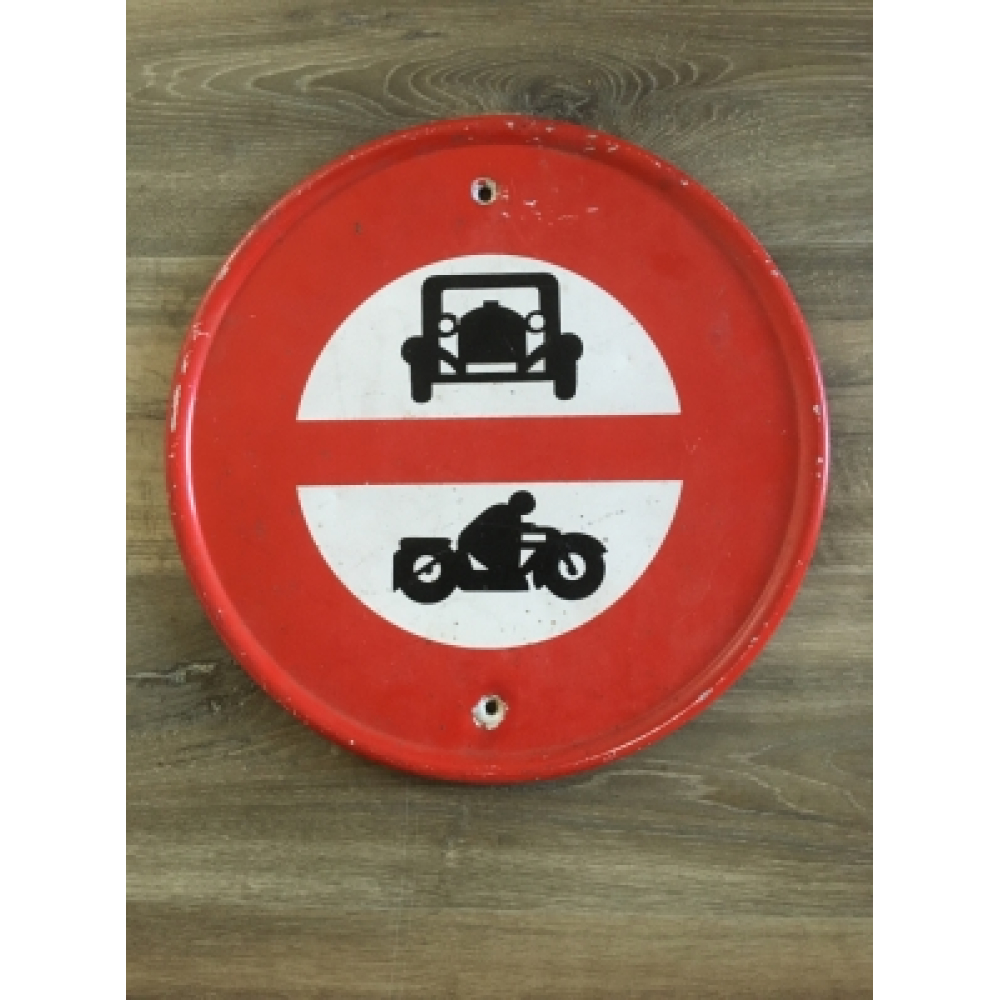 Vintage verkeersbord. Stoer rond verkeersbord uit de jaren 60, verboden voor auto's en motoren! Superstoer op de kinderkamer of natuurlijk de mancave. Helemaal van metaal, origineel, met een doorsnede van 40cm.