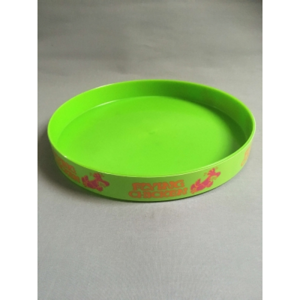 Dienblad van Flying Chicken. Mooi opvallend dienblad van Flying Chicken uit de jaren 80. Dit dienblad is van kunststof, heeft een felgroene kleur, een diameter van 29 cm en is in goede staat. De funky Flying Chicken-opdruk maakt het af!#flyingchicken #vintagedienblad #groen #groovy