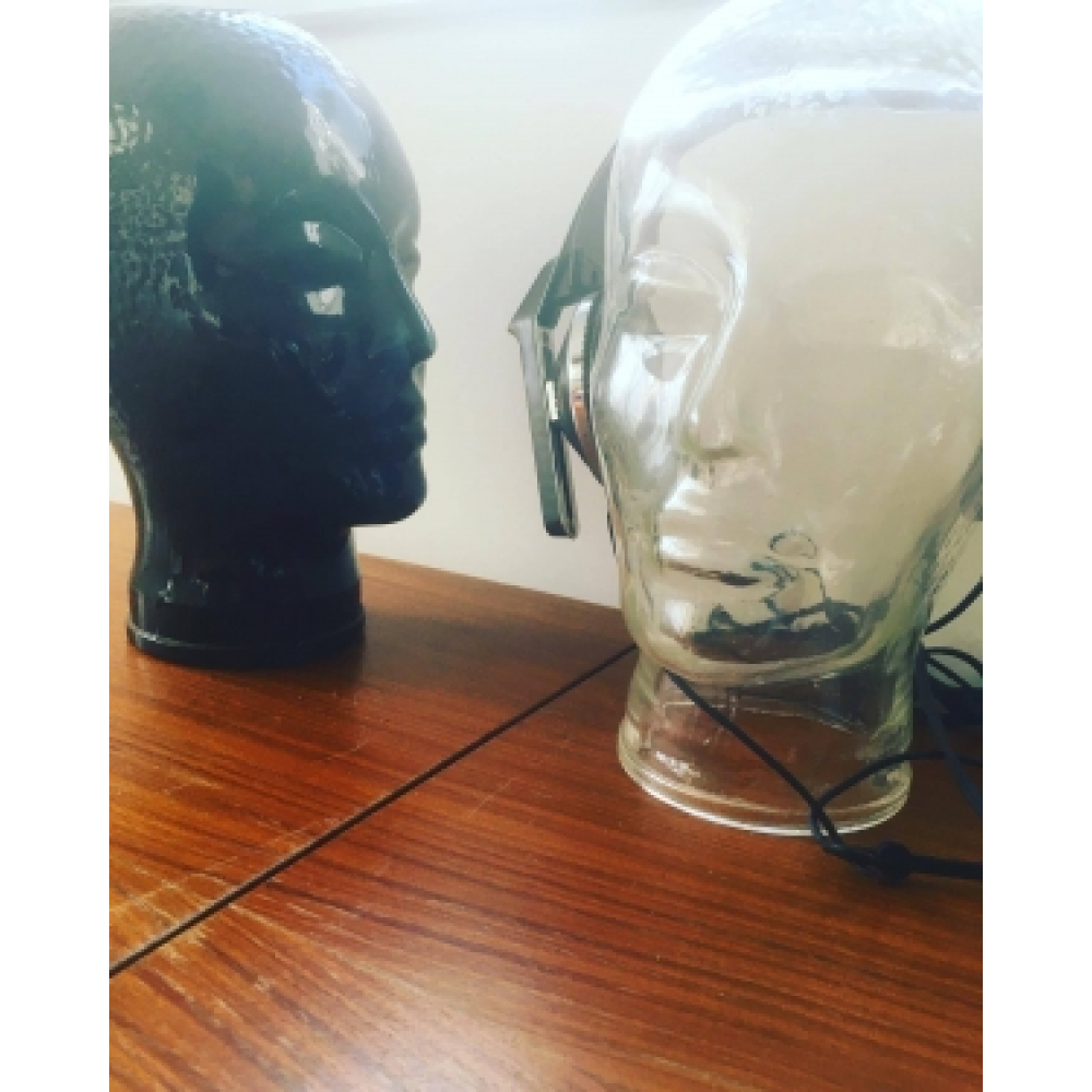 Glazen hoofd voor koptelefoon zwart. Deze glazen hoofden uit de jaren 70 zijn mooi, stijlvol en in goede staat. Ideaal voor natuurlijk je koptelefoon, maar ook voor je zonnebril of pet! Van oorsprong werden dit soort glazen hoofden uitgegeven bij de grote koptelefoons die destijds werden verkocht voor de stereo-apparatuur in de jaren '70. Ze zijn in diverse kleuren uitgegeven en zijn nog steeds erg decoratief. De hoogte van deze hoofden is 25 cm, de diameter is 15 cm. Nog één zwart glazen exemplaar verkrijgbaar, elders in deze categorie ook nog transparante, paarse, melkglazen en witte exemplaren. Prijs per stuk.