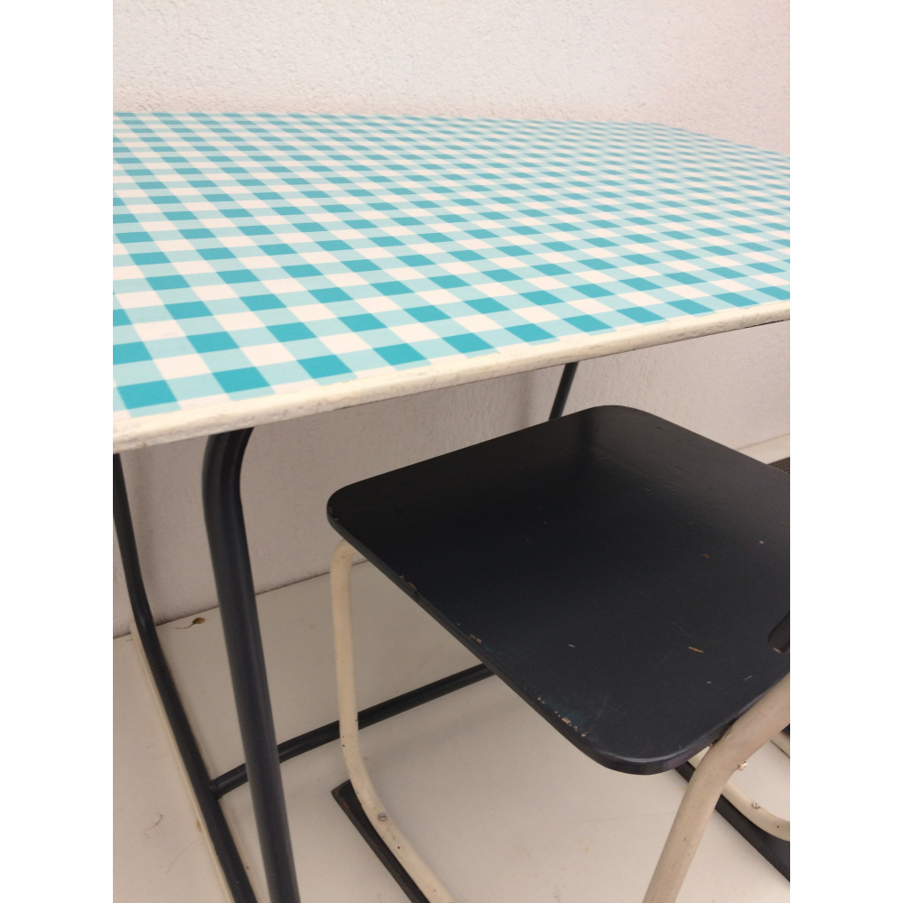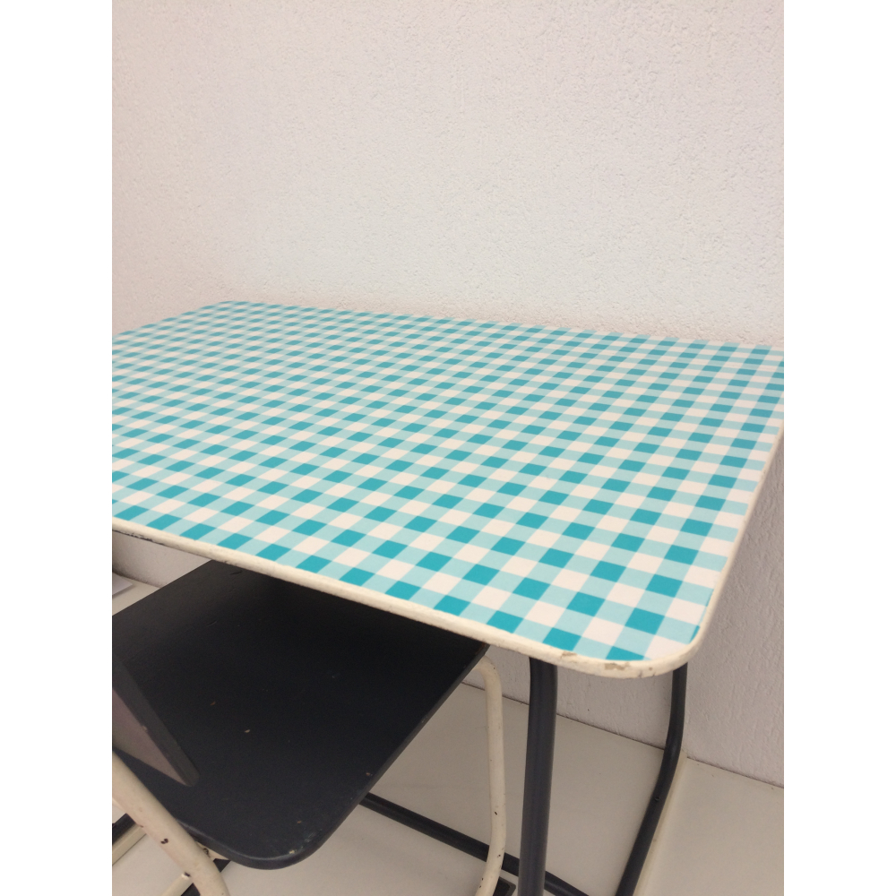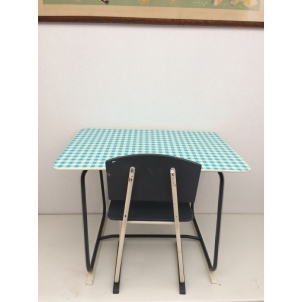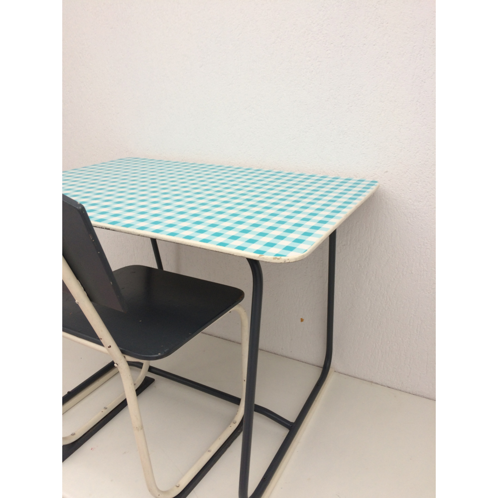 Lichtgewicht bureautje uit Belgie! Mooi lichtgewicht bureautje met een groen/wit geblokt blad van hout, een aluminium onderstel en een bijpassend stoeltje. Gevonden in Belgie en zeldzaam! Onder de pootjes van het tafeltje en het stoeltje zitten houten sledes zodat wat er ook gebeurt, het setje altijd blijft staan. Dit kindersetje verdient het mooiste plekje in een kinderkamer of huiskamer! De afmetingen van het tafeltje: 52,50 cm hoog, en het blad is 50 bij 73 cm. De zithoogte van het stoeltje is 33,5 cm.