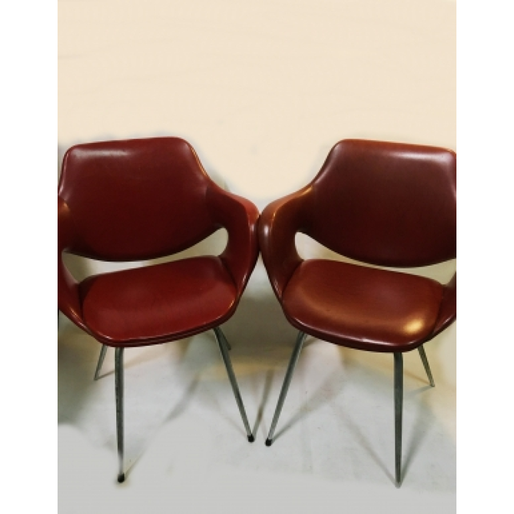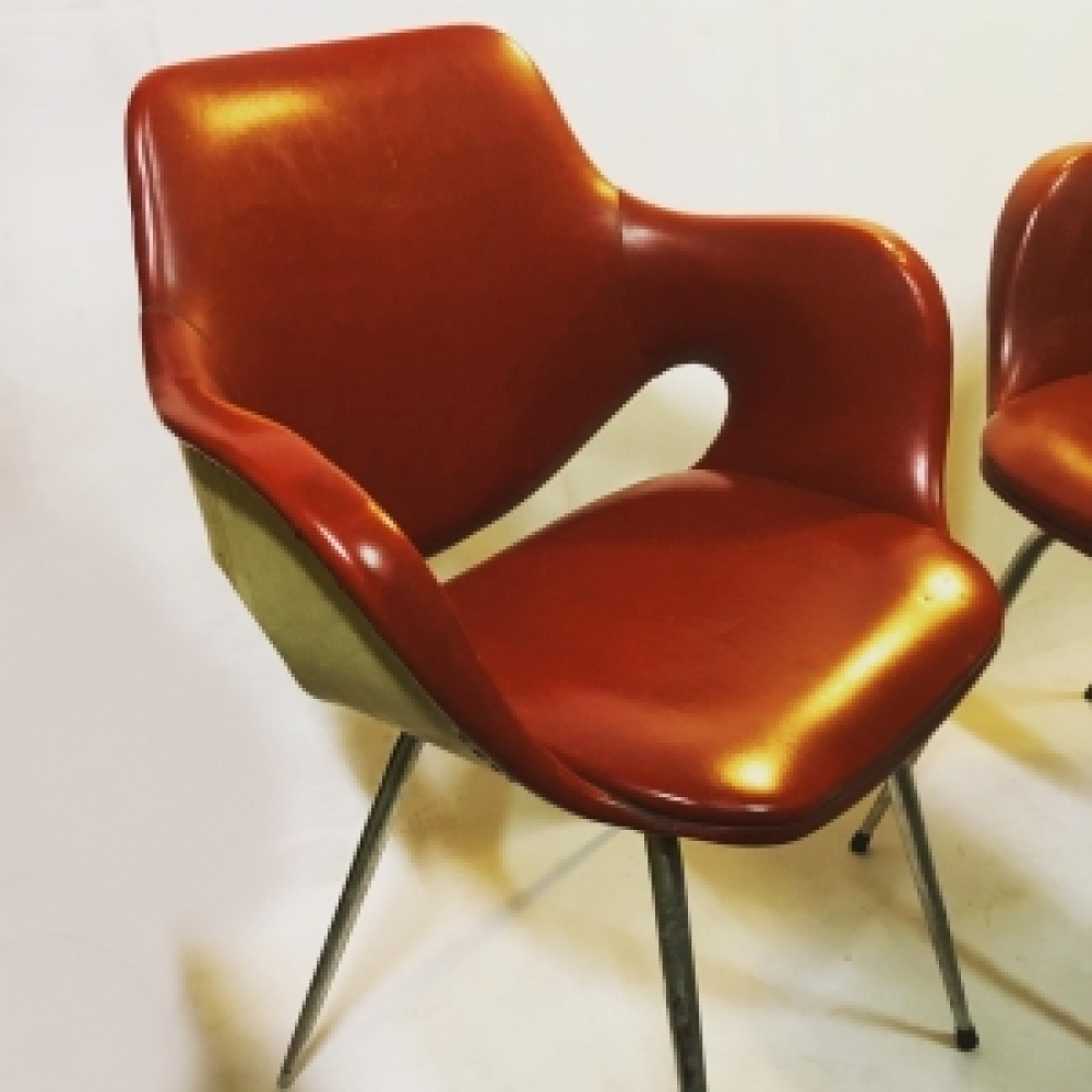 Midcentury design cocktailstoelen. Deze cocktailstoelen uit de jaren 60 hebben een prachtige vorm, mooie uitstraling en klaar voor een nieuwe ronde! Qua ontwerp lijken de stoelen op het design van Eero Saarinen, met stijlvolle chromen pootjes en een prachtige skaileren bekleding. Deze set bestaat uit twee stoelen en een hocker in een mooie originele vintage staat. Deze comfortabele stoelen bestaan uit een metalen buisframe met daarop een met donkerrood skaileer beklede kuip. De afmeting van deze stoel: totaal 84 cm hoog, 57 cm breed en 55 cm diep, en de prijs is voor de hele set. In verband met de omvang en kwetsbaarheid alleen op te halen bij de werkplaats van de Droomfabriek!