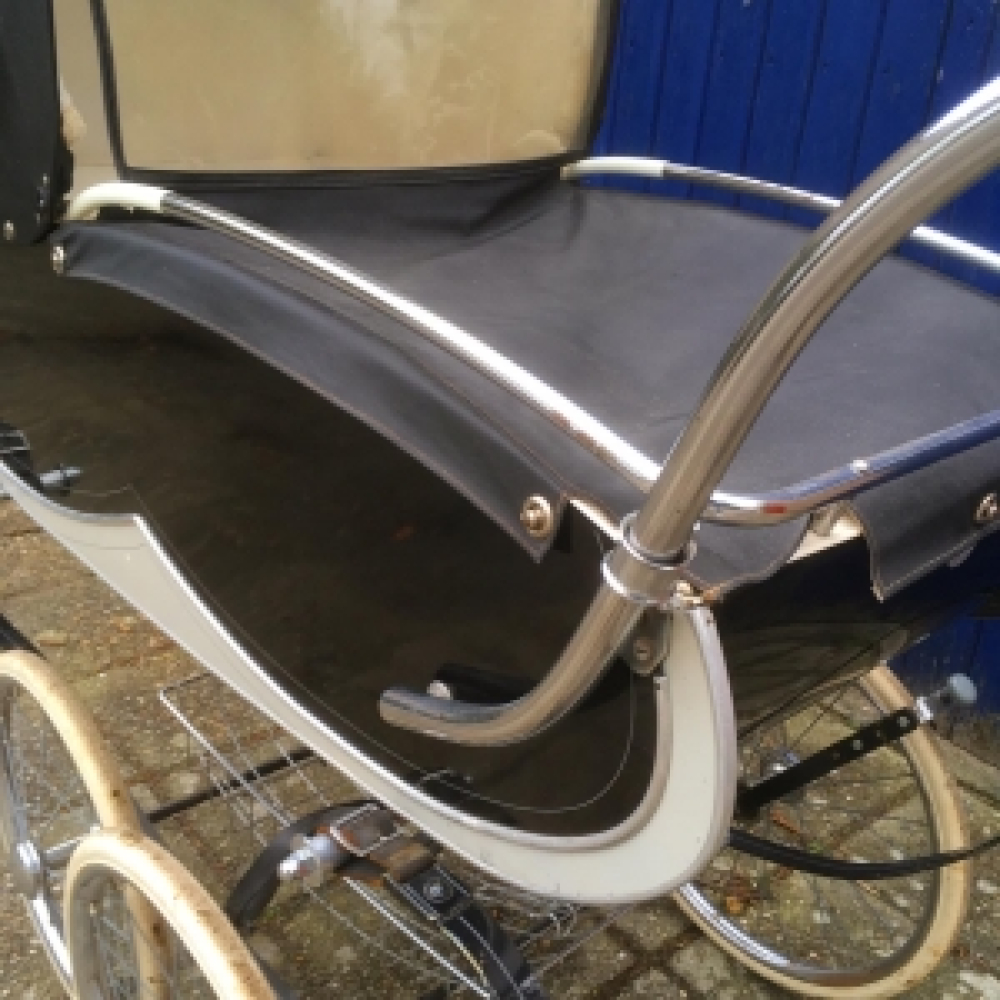 Prachtige vintage van Delft kinderwagen. Deze bijna antieke kinderwagen van het beroemde merk van Delft is in prachtige conditie, helemaal origineel en klaar voor een volgende ronde! Voorzien van een metalen onderstel (met mandje voor de babyspullen) met een mooie ronde vorm, prachtige wielen en geinige details zoals vering en een rem. Het wiegje is ook in goede staat, met een opklapbaar huifje en natuurlijk is de duwstang ook in te klappen. Het wiegje is ook vrij gemakkelijk van het onderstel te verwijderen zodat het kleintje lekker kan blijven slapen op een andere plek. Helemaal origineel, in prachtige staat en klaar voor een volgende ronde, voor de moeder die haar kind in stijl wil vervoeren! De afmetingen van deze kinderwagen zijn....Door het gewicht en omvang alleen af te halen bij de Droomfabriek. Deze is uitverkocht, maar er komt weer een nieuwe vintage kinderwagen aan, minstens even mooi....Bij vragen stuur even een berichtje aan info@droomfabriek.info
