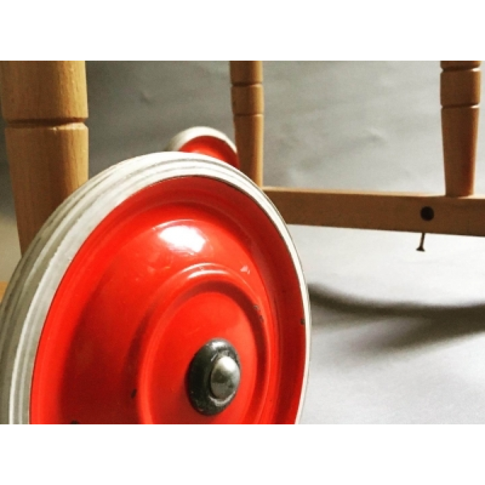 Retro vintage poppenwieg of poppenwagen. Toffe poppenwieg van hout, met knalrode details en natuurlijk lichtmetalen wielen! Deze poppenwagen is helemaal te demonteren, in goede staat en klaar voor een nieuwe ronde. De afmetingen van deze poppenwieg of -wagen zijn (LxBxH): 64,5x40x60cm.#poppenwagen #poppenwieg #vintagespeelgoed #retrospeelgoed