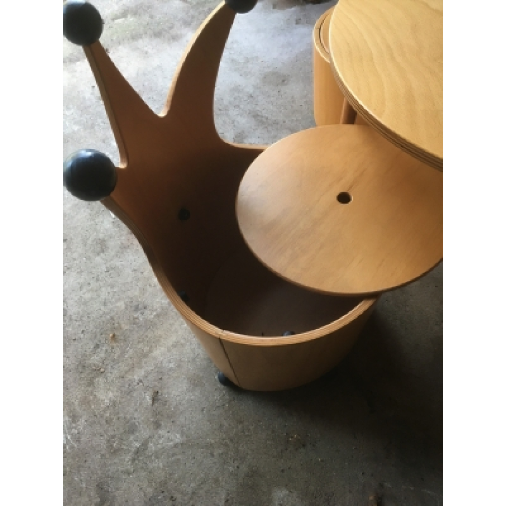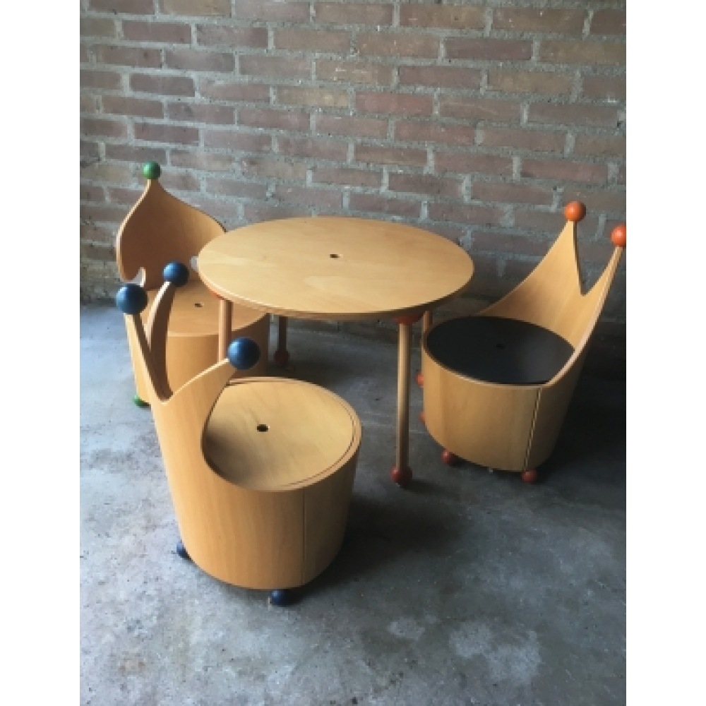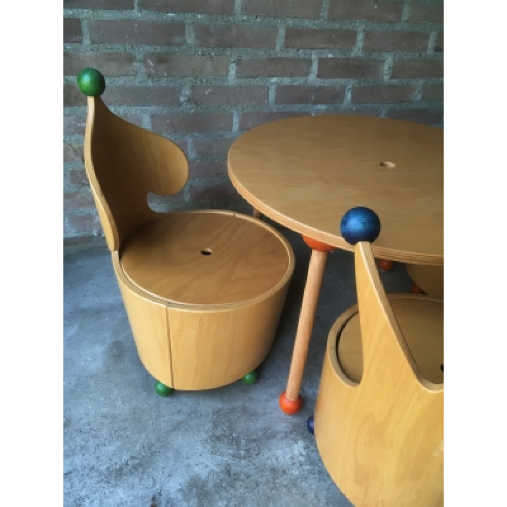Vintage design kindersetje nr 05. Dit kindersetje bestaat uit drie stoeltjes met bijpassend rond tafeltje, uit de jaren 80, een aanwinst voor elke kinderkamer of huiskamer! Het setje is gemaakt van blank gelakt beukenhout, en is in een prachtige conditie. De stoeltjes hebben stevige ronde knopjes als pootjes waardoor ze stevig staan en de rugleuning is bovenop versierd met ronde knoppen waardoor het er leuk uitziet en veilig voor kinderen is. De zitting is uitneembaar, dus in de stoel is er ruimte voor alle speelgoed. Ook de tafel is mooi afgewerkt met ronde knoppen aan de pootjes zodat de tafel stevig staat en niet krast op de vloer. De zithoogte van deze schoolstoeltjes is cm, de tafel is cm hoog met een diameter van cm, geschikt voor peuters. De prijs is voor de complete set, de stoeltjes zijn niet los verkrijgbaar.
