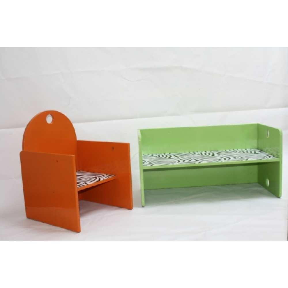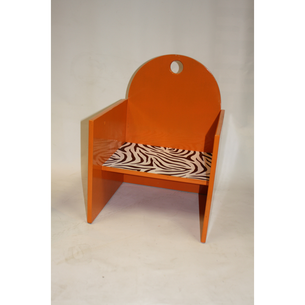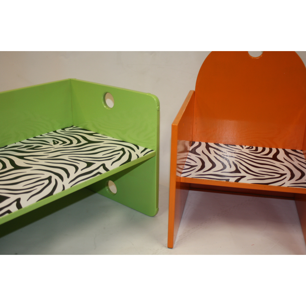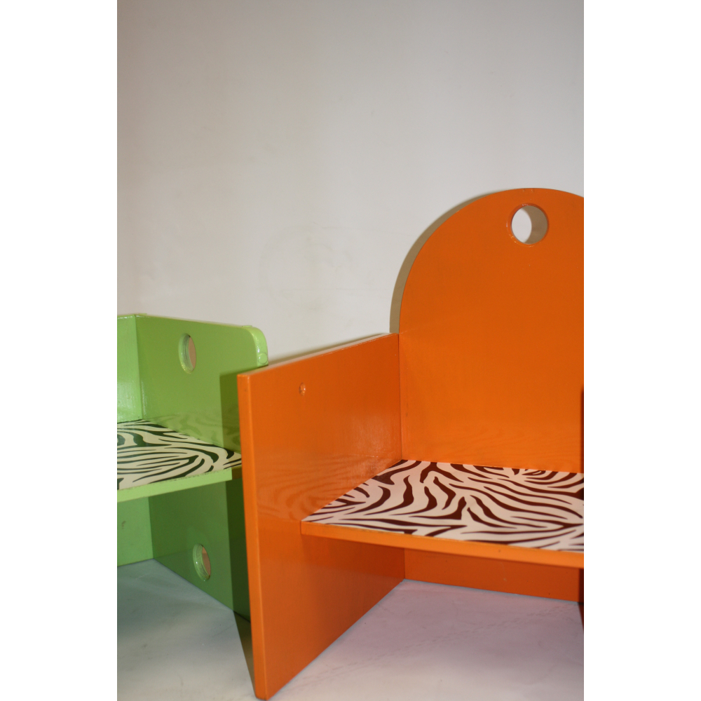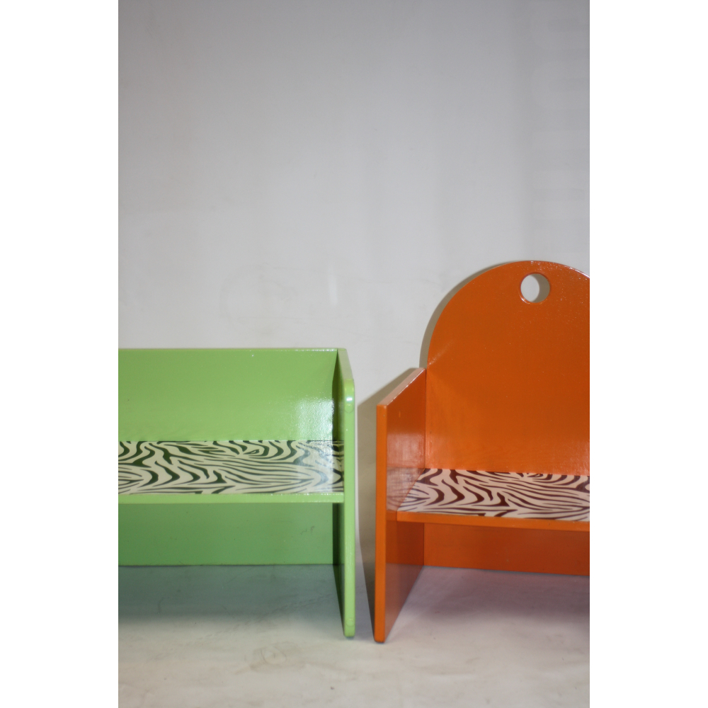 Vintage stoeltje en bankje. Vintage stoel en bankje uit een oude kleuterschool. Het houten bankje heeft een appeltjesgroene kleur gekregen, het houten stoeltje fel oranje, en de zittingen zijn gelamineerd met een zebraprint. Oersterke meubeltjes die weer gezien mogen worden! Deze twee worden als stel verkocht, maar eventueel zijn ze ook los te koop, ze kosten dan 40,00 euro per stuk. Het oranje stoeltje is 36 cm breed en diep en de rugleuning is ongeveer 45 cm hoog. Het bankje is 100 cm breed, 36 cm hoog en 36 cm diep.