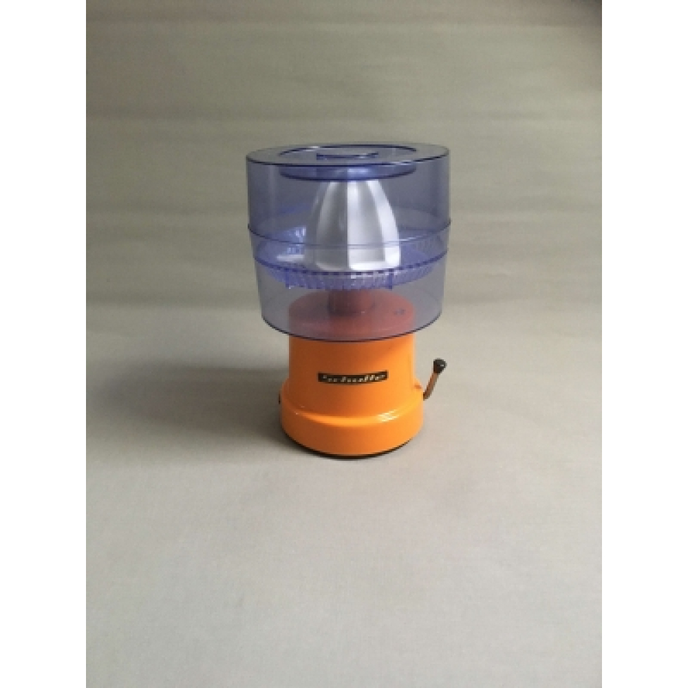 Seventies Schulte juspers. Deze kunststof juspers van het bekende Duitse merk Schulte is een aanwinst voor elke keuken met zijn feloranje kleur, en het mooiste is nog: je hebt er geen elektriciteit voor nodig! Met een zwengel drijf je de pers aan, en natuurlijk is hij ook voorzien van een zuignap om er voor te zorgen dat hij niet omvalt als je aan het persen bent. In goede staat, klaar voor verse jus!#vintagejuspers #schultejuspers #oranje #zuignap #70s