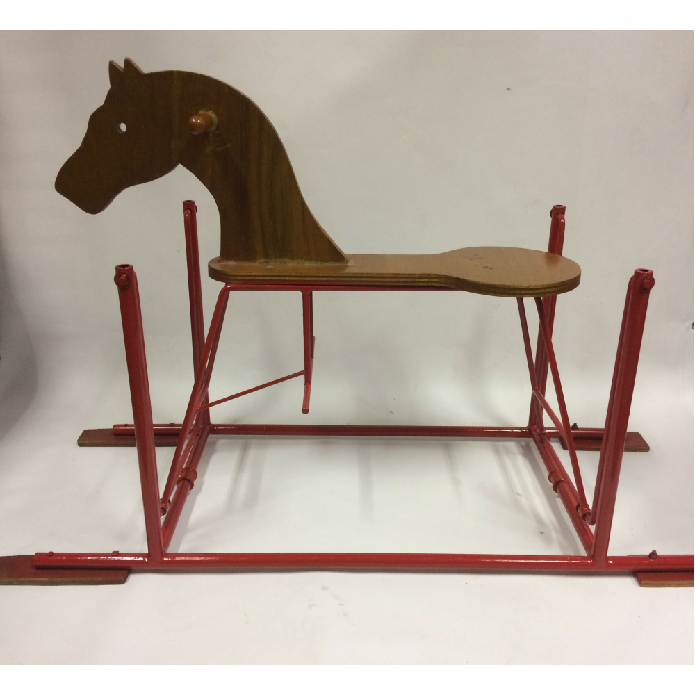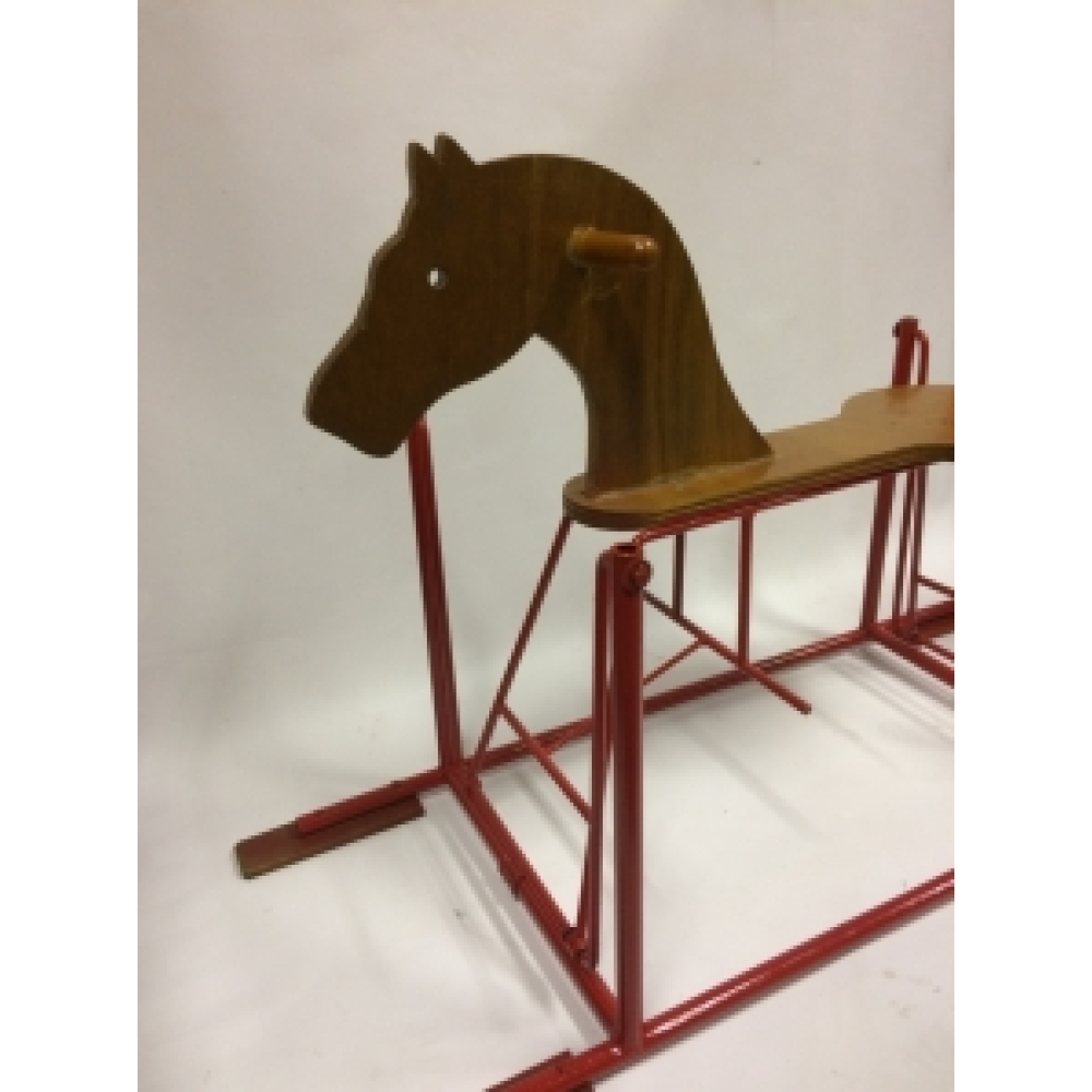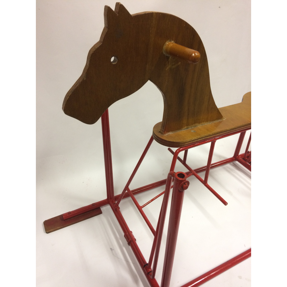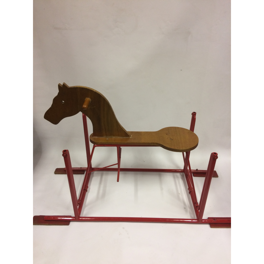 Vintage industrieel hobbelpaard. Prachtig vintage hobbelpaard met een ijzeren frame en een houten zitting. Dit hobbelpaard komt uit de jaren 70, en vooral het frame met ijzeren staafjes is heel bijzonder. Het geheel oogt licht, maar is stevig en robuust, goed voor uren speelplezier! Door grootte en kwetsbaarheid alleen af te halen bij de Droomfabriek. De afmetingen van dit hobbelpaard zijn