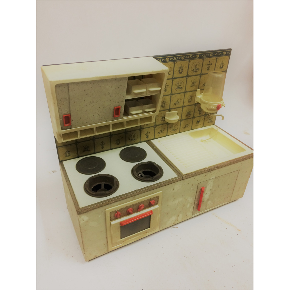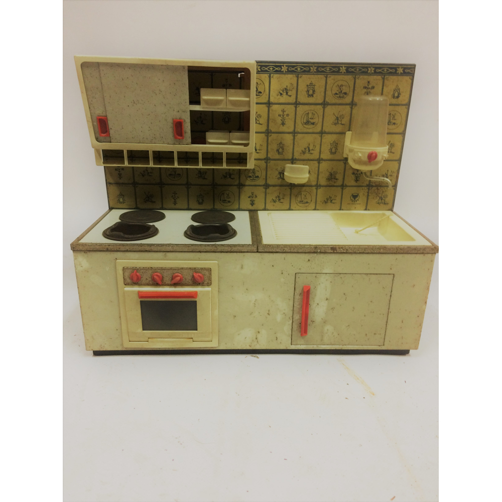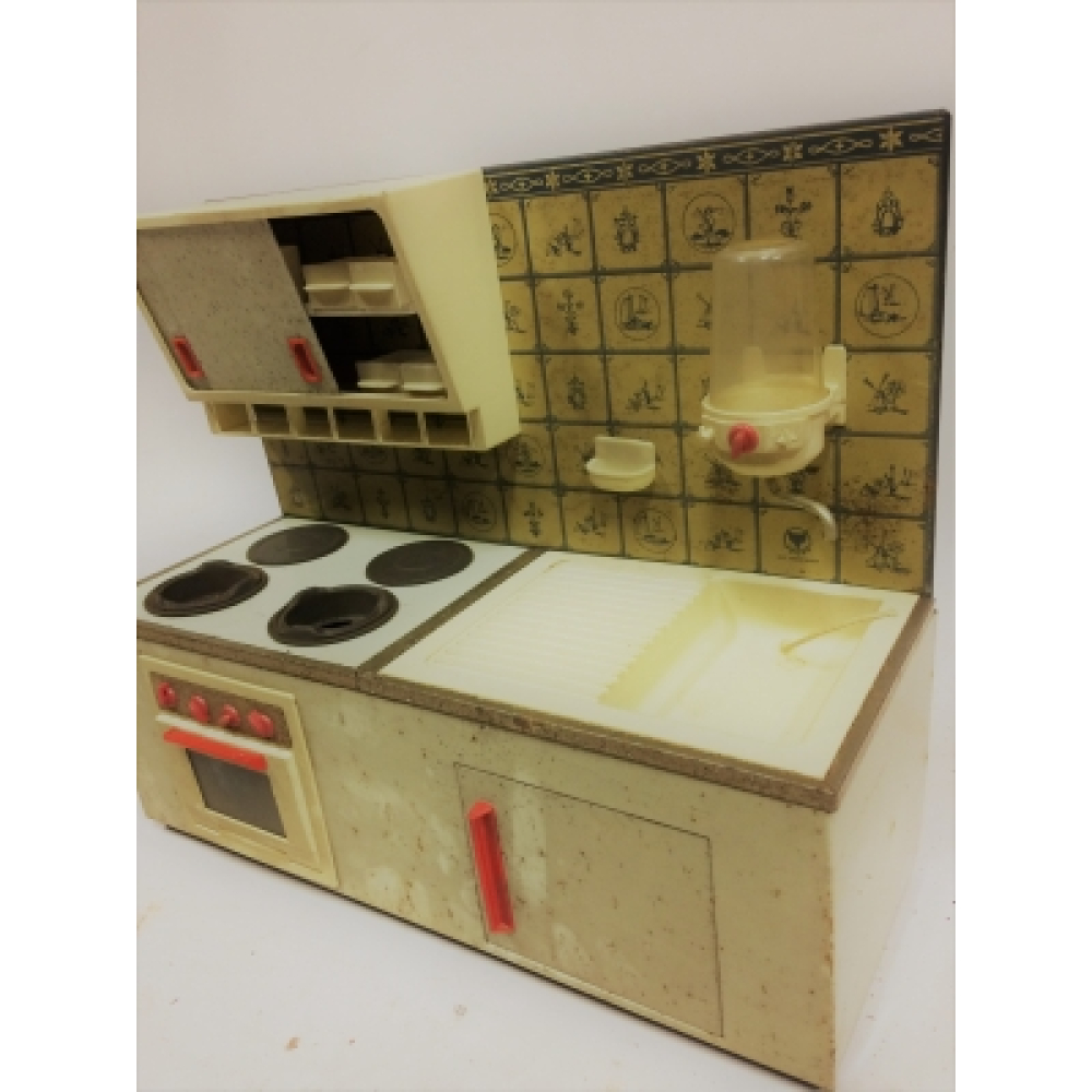 Vintage blikken keukentje. Mooi vintage speelkeukentje van blik. Dit keukentje is niet meer gebruikt sinds de jaren 60, dus met stof, en een prachtig patina. Alles zit erop en eraan, alle deurtjes werken, en dit speelkeukentje wacht erop om weer opnieuw tot leven gewekt te worden door een peuter! De afmetingen zijn: lengte 35 cm, hoogte 29,5 cm, en de diepte is 13 cm. Deze is verkocht, maar we hebben nog andere op voorraad, mail even bij interesse!