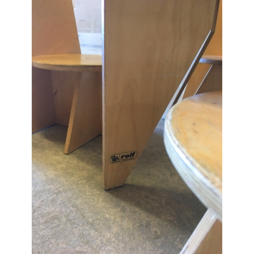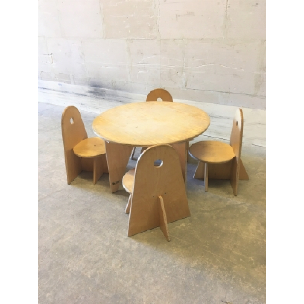 Vintage design ('Apollo design') ADO kindersetje nr 92. Vier stuks originele vintage design houten schoolstoeltjes van ADO ('Apollo Design') uit de jaren 80 met bijpassend rond Rolf tafeltje, een aanwinst voor elke kinderkamer of huiskamer! Van blank gelakt hout, in mooie vintage conditie, en ze worden zeldzaam! De zithoogte van deze schoolstoeltjes is 22,5 cm, de tafel is 44 cm hoog met een diameter van 74 cm, geschikt voor peuters. De prijs is voor de complete set.
