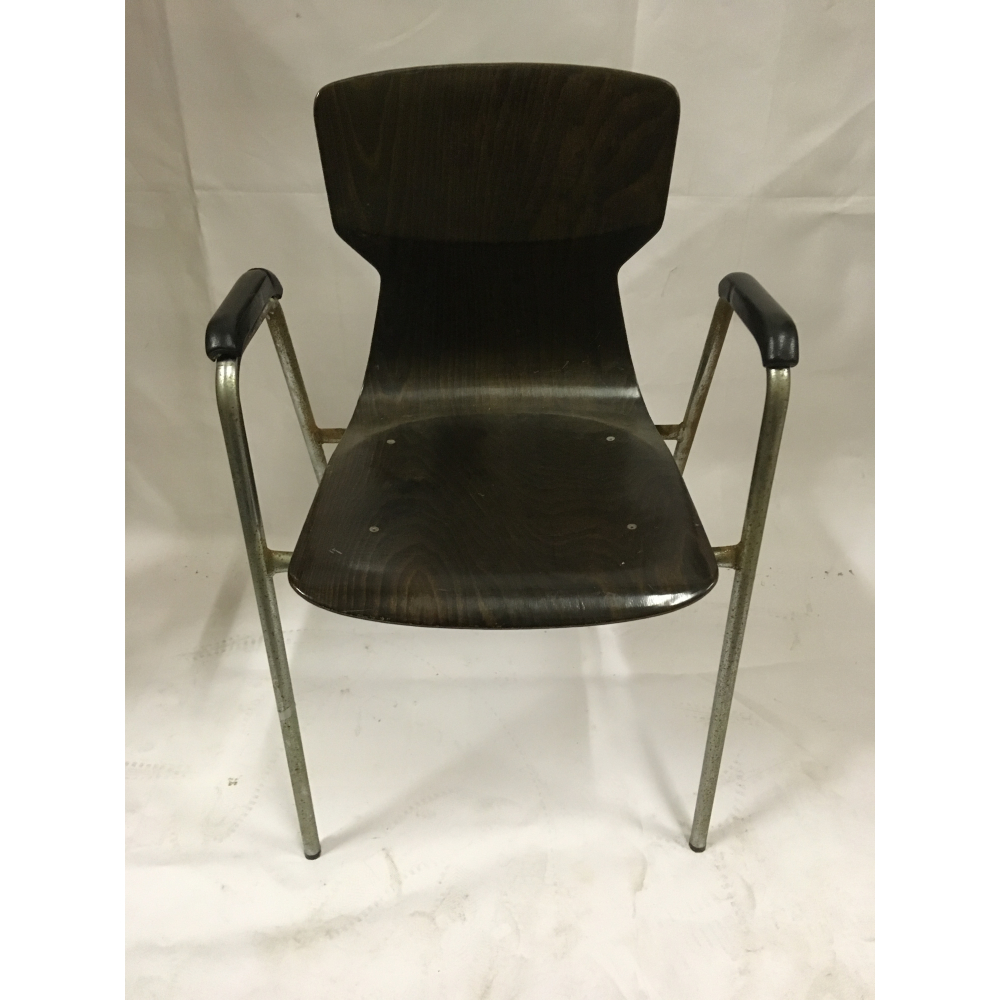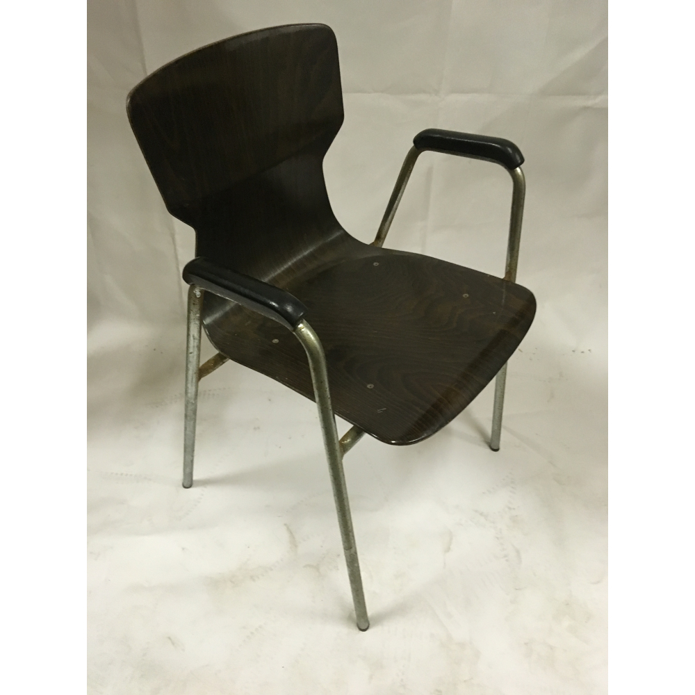Vintage design Eromes stoel. Mooie vintage design Eromes stoel eetkamer- of vergaderstoel, met een plywood zitting, een ijzeren frame en stevige armleuningen. Stijlvol, strak en tijdloos. Gemaakt door de welbekende fabrikant Eromes in de jaren 70, mooi en onverslijtbaar! De zithoogte van deze stoel is 46 cm.