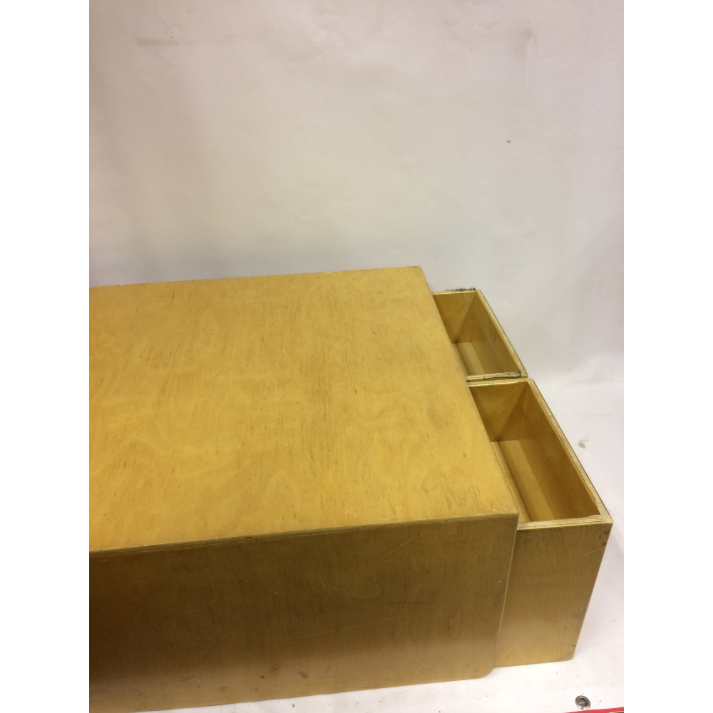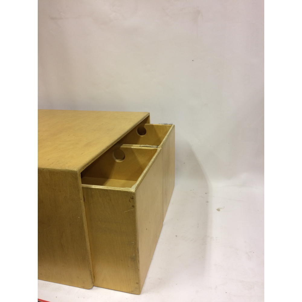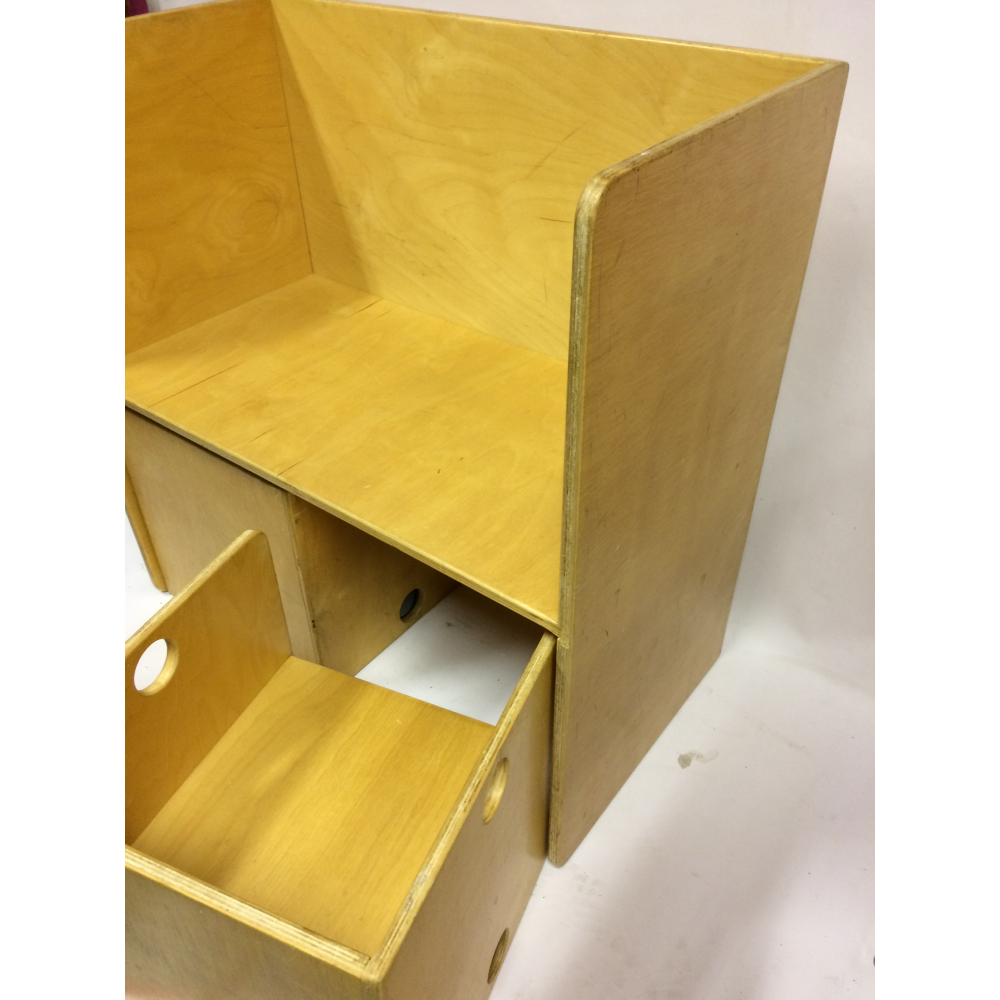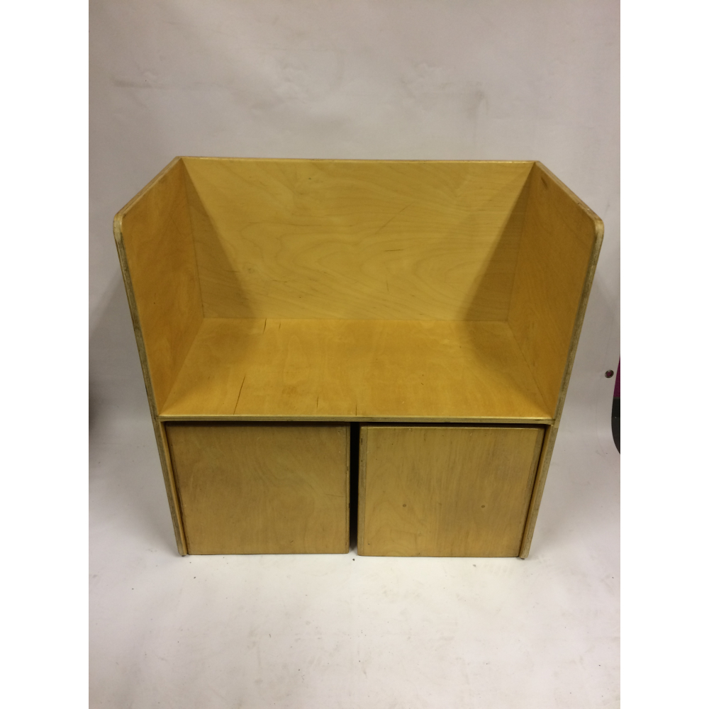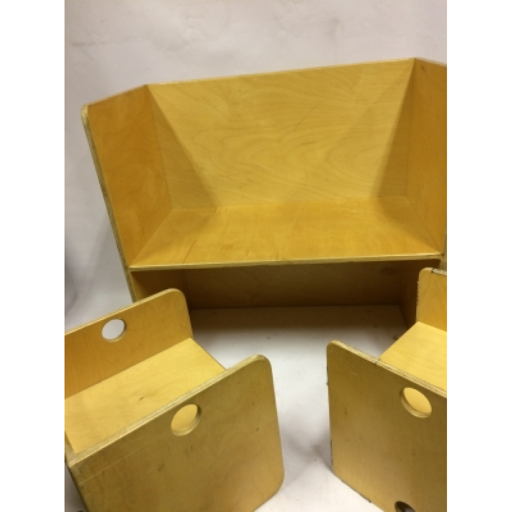 Vintage design kindersetje met kubusbankje en twee stoeltjes nr 124. Prachtig vintage kindersetje van Van Dijk Toys met een tafeltje en twee kubusstoeltjes. Het leuke van dit setje is dat het op verschillende manieren te gebruiken is, het tafeltje kan namelijk ook dienen als bankje, de twee stoeltjes passen er dan ook precies onder. De stoeltjes kun je op verschillende manieren neerzetten, en het wordt dan een stoeltje met lage zit, met hoge zit of een tafel. Gemaakt van oersterk berken multiplex, verrassend en praktisch! De afmetingen van de stoeltjes zijn 35x35x35cm, de afmeting van het complete setje is . Prachtig voor op een kinderkamer, speelzolder of natuurlijk in de huiskamer! Natuurlijk kun je het setje ook uitbreiden met andere stoeltjes of bankjes.