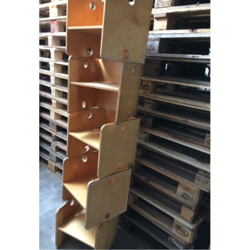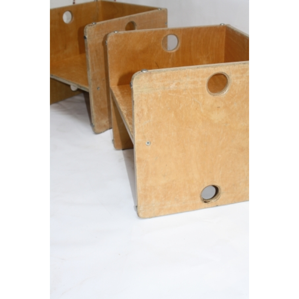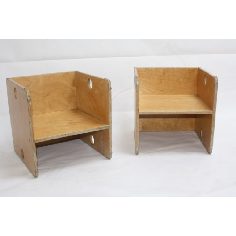 Vintage design kubusstoeltje van Van Dijk Toys. Stoer, oersterk en onverslijtbaar! Een echte kindermeubel-klassieker is deze kubusstoel. Gemaakt van oersterk berken multiplex, door hem op verschillende manieren neer te zetten wordt het een stoel met lage zit, met hoge zit of een tafel. In goede vintage staat, nog twee exemplaren verkrijgbaar. De afmetingen van deze kubusstoel zijn 35x35x35cm, prijs per stuk.