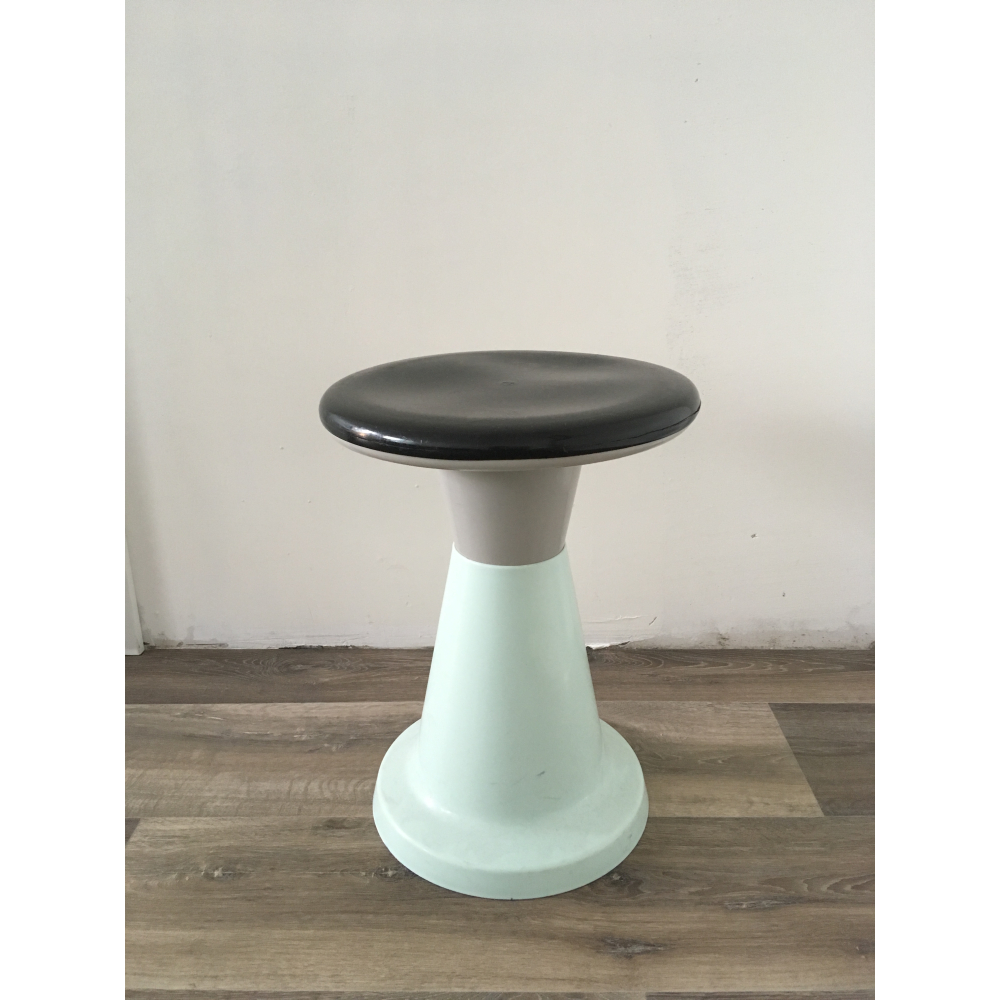 Vintage Diabolo krukje mintgroen. Dit diabolo-krukje komt uit de jaren 70, is van kunststof, en is een mooi overblijfsel uit de space-age. Het leuke aan dit krukje is dat het twee kleuren heeft, namelijk mintgroen van onderen en grijs van boven, met een zwarte deksel. Leuk voor op de kinderkamer of natuurlijk in de huiskamer. Het krukje is 44 cm hoog en de diameter is 29 cm.
