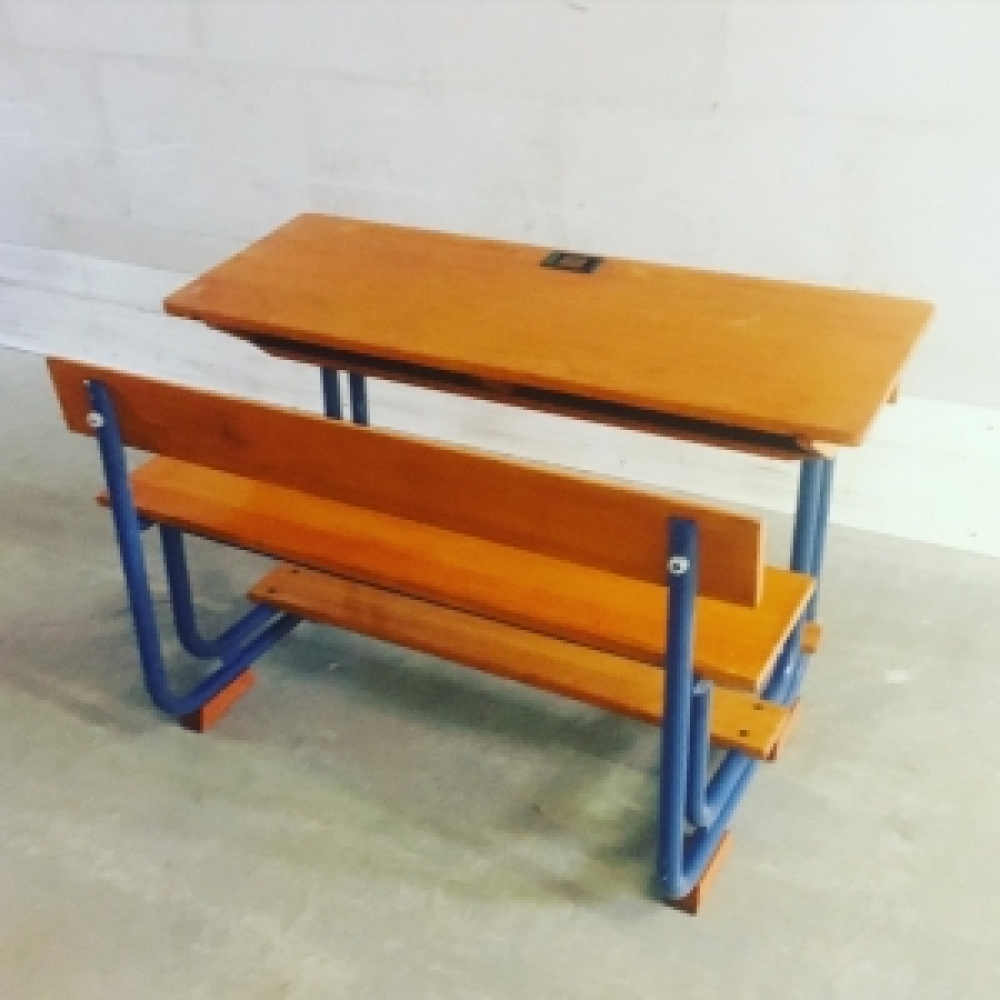 Vintage dubbel schoolbankje nr 9. Mooi origineel vintage schoolbankje voor twee kinderen, ijzersterk en met een prachtig patina! Het bankje is helemaal origineel en zo te gebruiken, heeft een zwaar ijzeren frame en een houten bak met daarin genoeg bergruimte voor alle tekeningen, stiften en andere belangrijke spullen. De lengte van dit duozit-schoolbankje is 110 cm, de diepte is 64 cm, de totale hoogte is 71 cm, en de zithoogte vanaf de grond is 43 cm. Door de omvang en het gewicht is dit schoolbankje alleen af te halen in de werkplaats van de Droomfabriek! Binnenkort is er weer een nieuw exemplaar beschikbaar, voor meer info mail naar info@droomfabriek.info