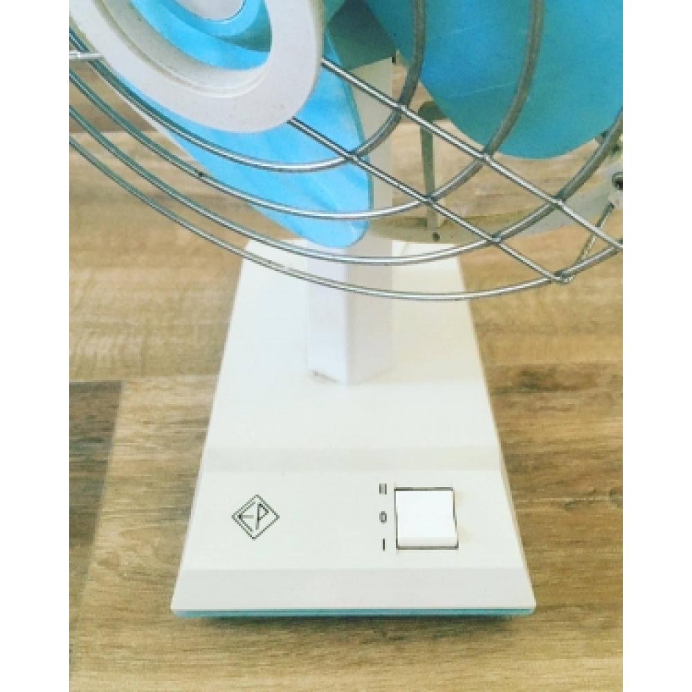 Vintage EP tafelventilator. Mooie ventilator van het merk EP uit de sixties. Deze ventilator is helemaal origineel, met een mooie aquamarijnblauwe kleur en in goede staat. Met twee snelheden en op diverse manieren te richten. De hoogte van deze tafelventilator is 35 cm, en hij is klaar voor de warme zomer!