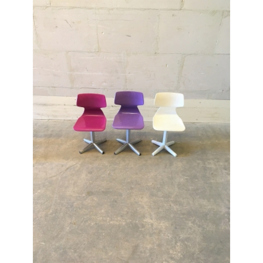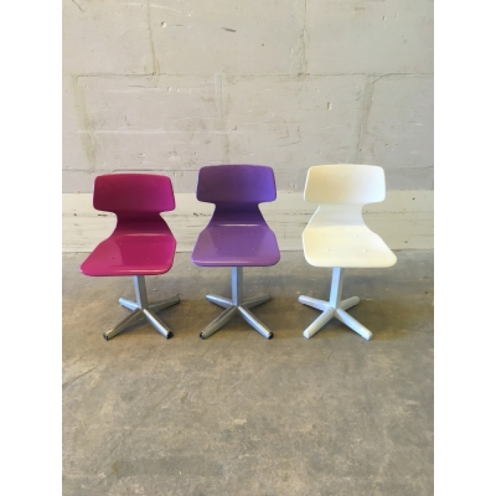 Vintage gekleurde schoolstoeltjes nr 107. Prachtige schoolstoeltjes, met een stalen poot en plywood zittingen, oersterk en niet kapot te krijgen! In vrolijke kleuren geverfd, de witte en paarse hebben een zithoogte van 34 cm, de roze een zithoogte van 31 cm, prijs per stuk. Ideaal voor in de speelhoek of bijvoorbeeld bij een tafeltje!