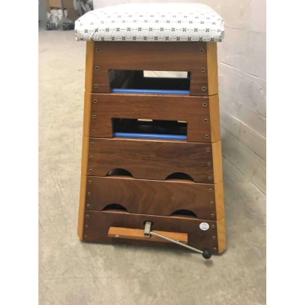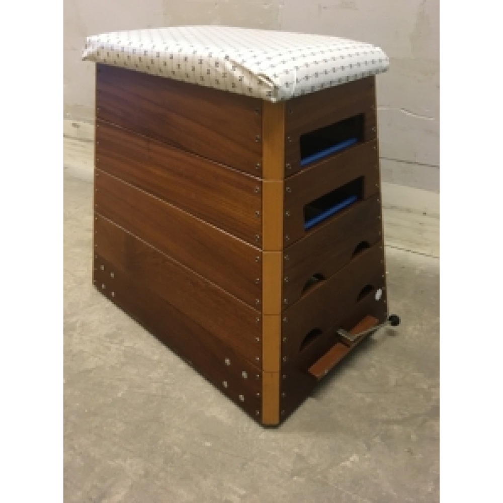 Vintage gymkast nr 67. Mooie vintage gymkast uit de jaren 80 van de firma Janssen Fritsen in goede conditie. De gymkast is gemaakt van hout, met een ijzeren binnenframe en hefmechanisme om hem makkelijk te kunnen verplaatsen. Het kussen bovenop is opnieuw gestoffeerd met een kunststof bekleding met vintage print. Het geheel bestaat uit 5 lagen, is gemakkelijk uit elkaar te halen en kan dus ook eenvoudig gesplitst worden. Stoer en onverwoestbaar! De afmetingen van deze kast zijn: hoogte 88 cm, 119 cm lang en 66 cm diep. Door de omvang en het gewicht kan deze kast alleen afgehaald worden bij de werkplaats van de Droomfabriek.