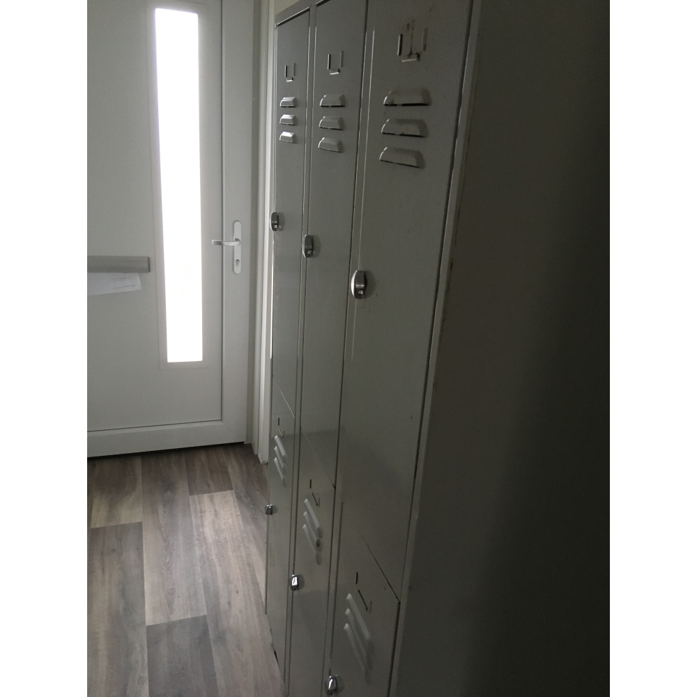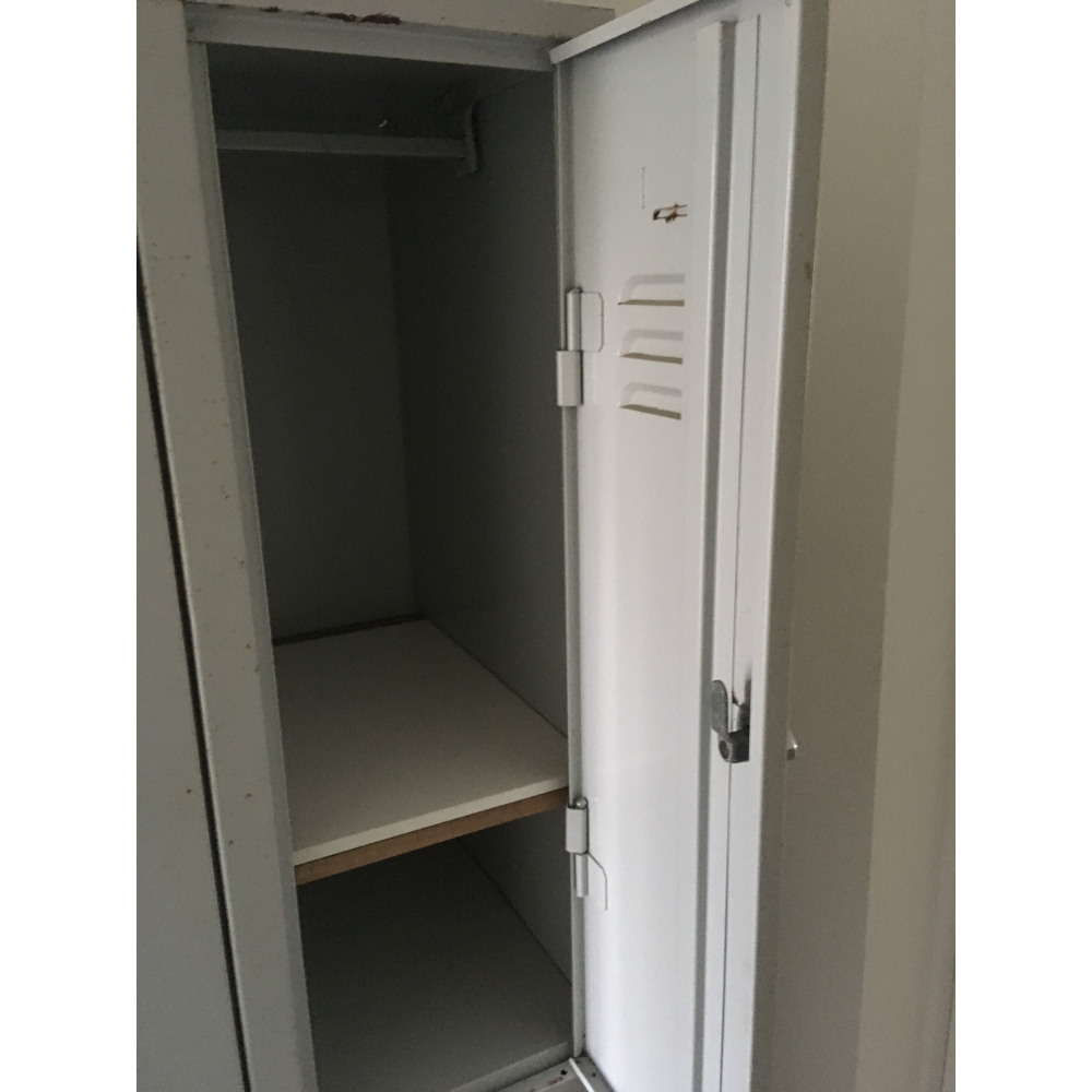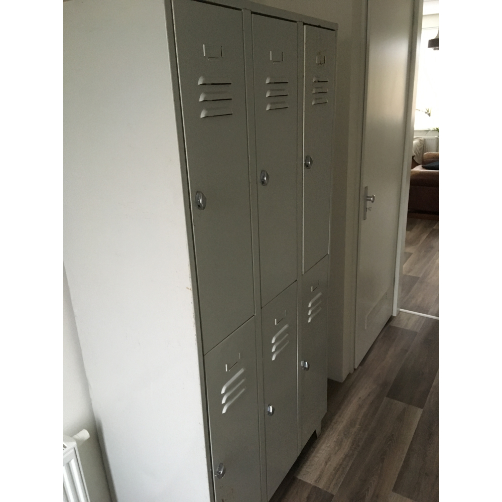 Prachtige ijzeren lockerkast uit een oude werkplaats! Deze metalen lockerkast is robuust, zwaar en voorzien van 6 deurtjes met daarachter heel veel opbergruimte. Eenvoudig te voorzien van legplanken, ideaal als kledingkast op de kinderkamer of als opbergkast voor alle speelgoed. De afmetingen van deze stoere kast zijn ongeveer 100cm bij 60 cm, de hoogte is ongeveer 185cm. Alleen af te halen!
