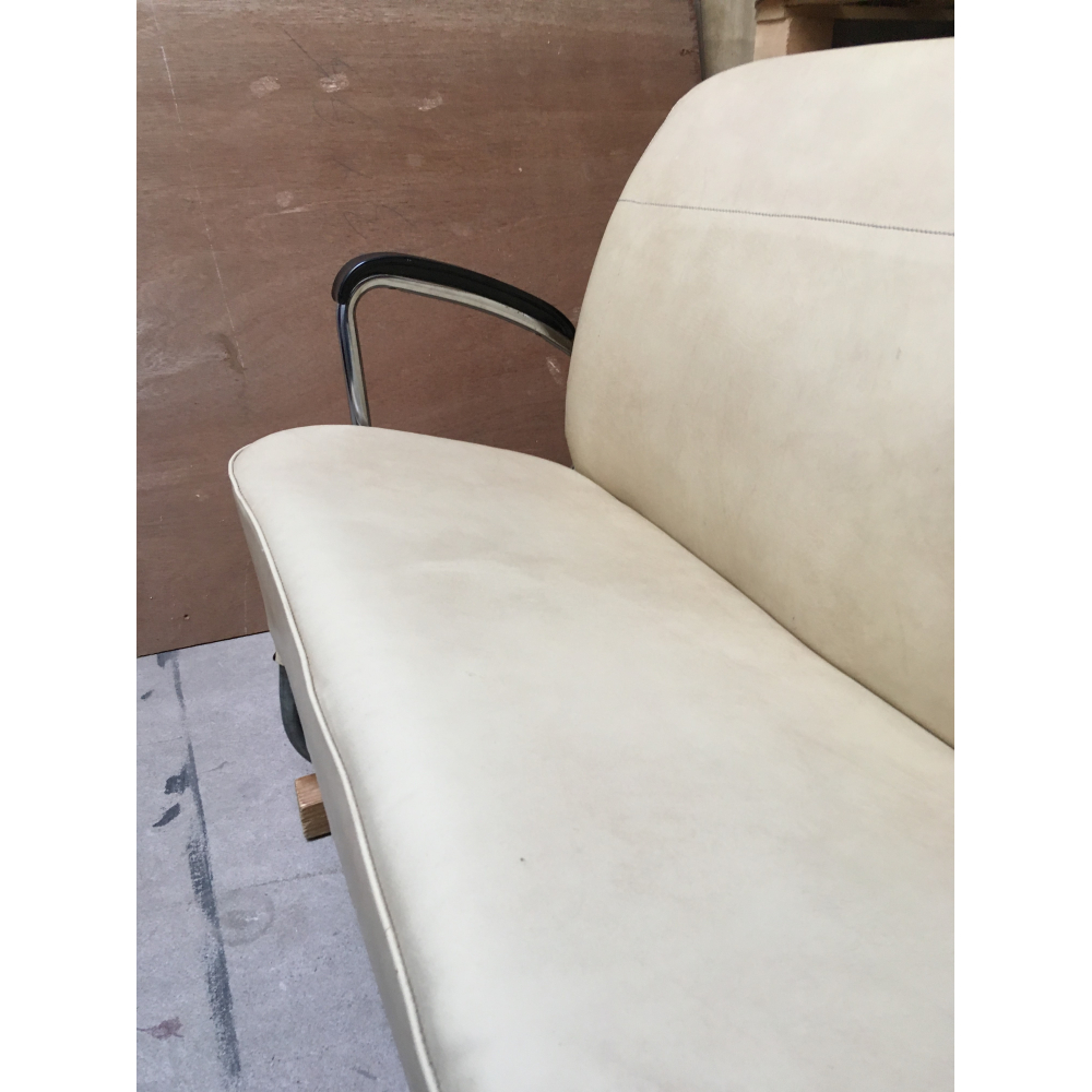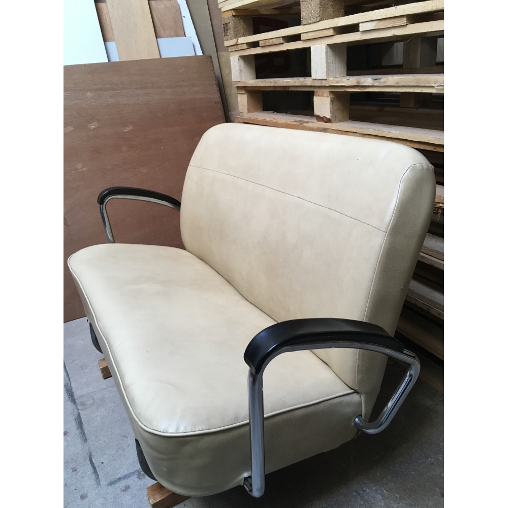 Prachtig kinderbankje uit de jaren 60! Dit bankje heeft jarenlang dienst gedaan in een stadsbus, en was te leuk om niet mee te nemen. Bekleed met skai, met een mooi verchroomd frame en bakelieten armsteunen, nog helemaal origineel en in goede staat. De afmetingen van dit bankje zijn 110 cm breed, totaal 75 cm hoog en zithoogte 32 cm. De zithoogte kan eventueel aangepast worden door de hoogte van de houten balkjes onder de sledes.