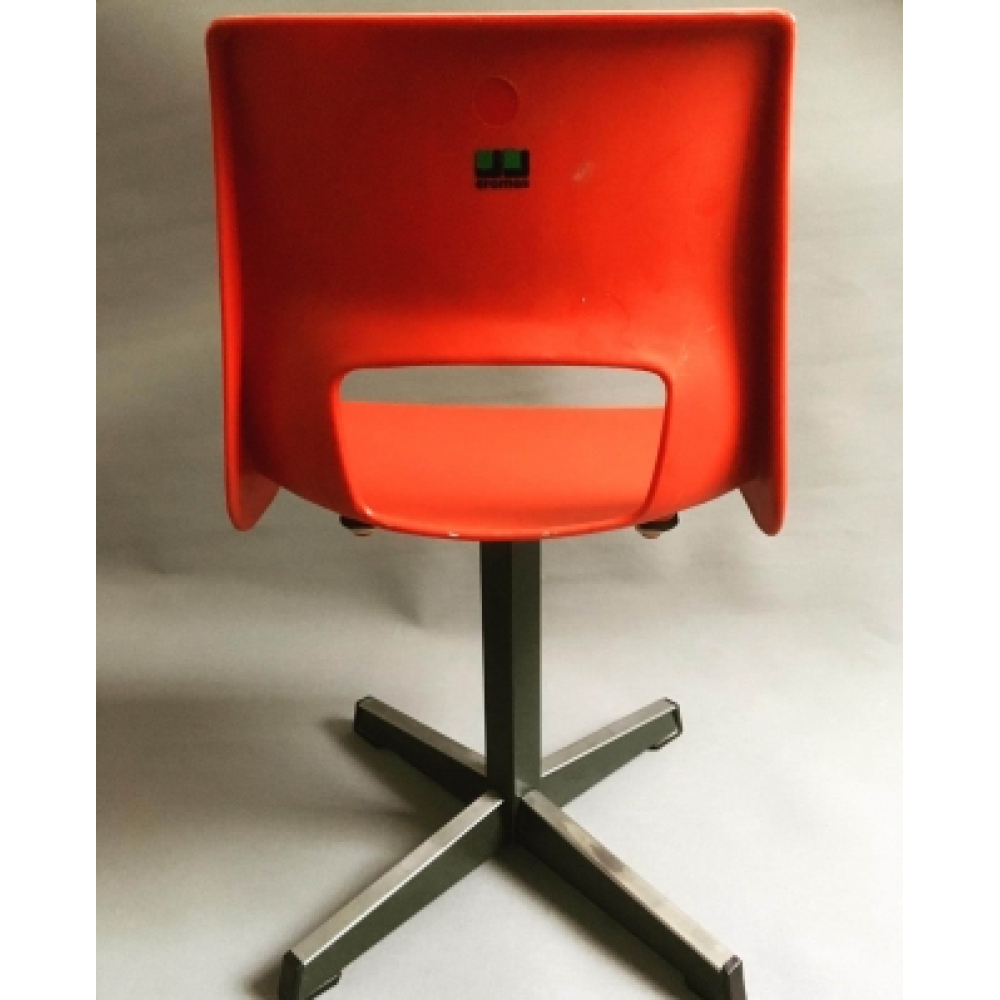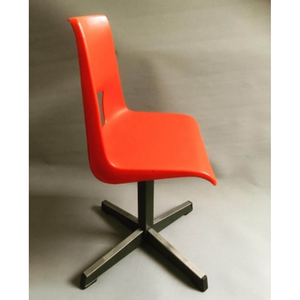 Vintage knalrood Eromes schoolstoeltje, zithoogte 32 cm. Mooi Eromes schoolstoeltje uit de jaren zeventig. Met een stevige stalen poot en een rode kuip, in goede staat en onverwoestbaar! Leuk voor in de woonkamer of bij een tafeltje! De zithoogte van dit schoolstoeltje is 32 cm.