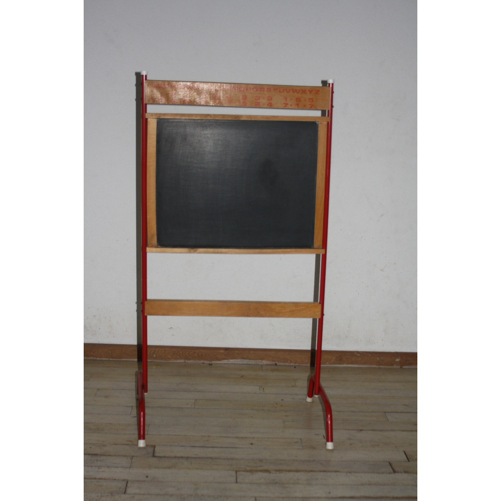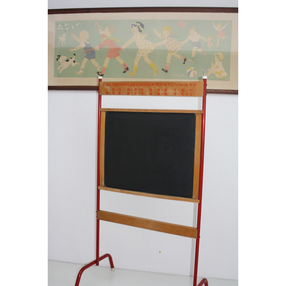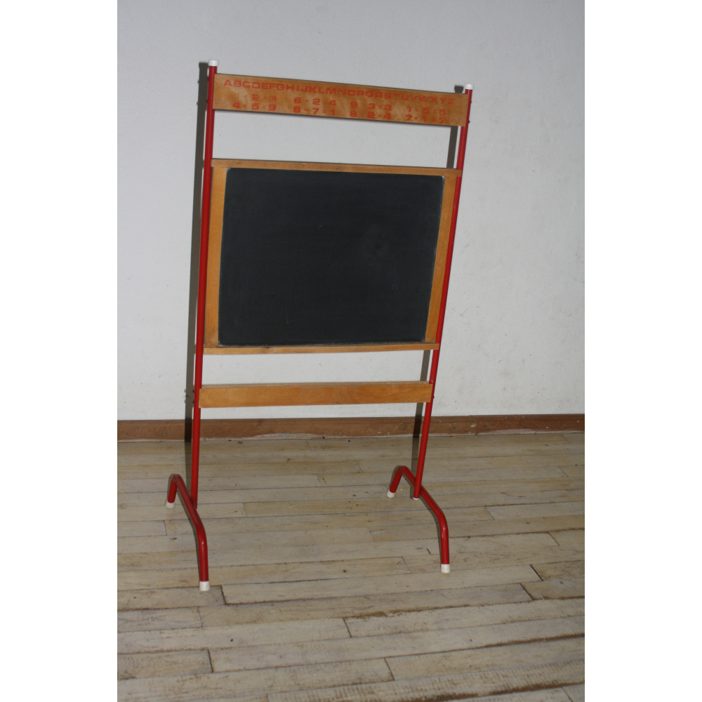 Vintage dubbelzijdig schoolbord met een rood ijzeren frame en een houten bord. Dit bord is eenvoudig in hoogte te verstellen met twee schroefjes, en het alfabet bovenaan maakt het af. Ongeveer 66 cm breed, 109 cm hoog.