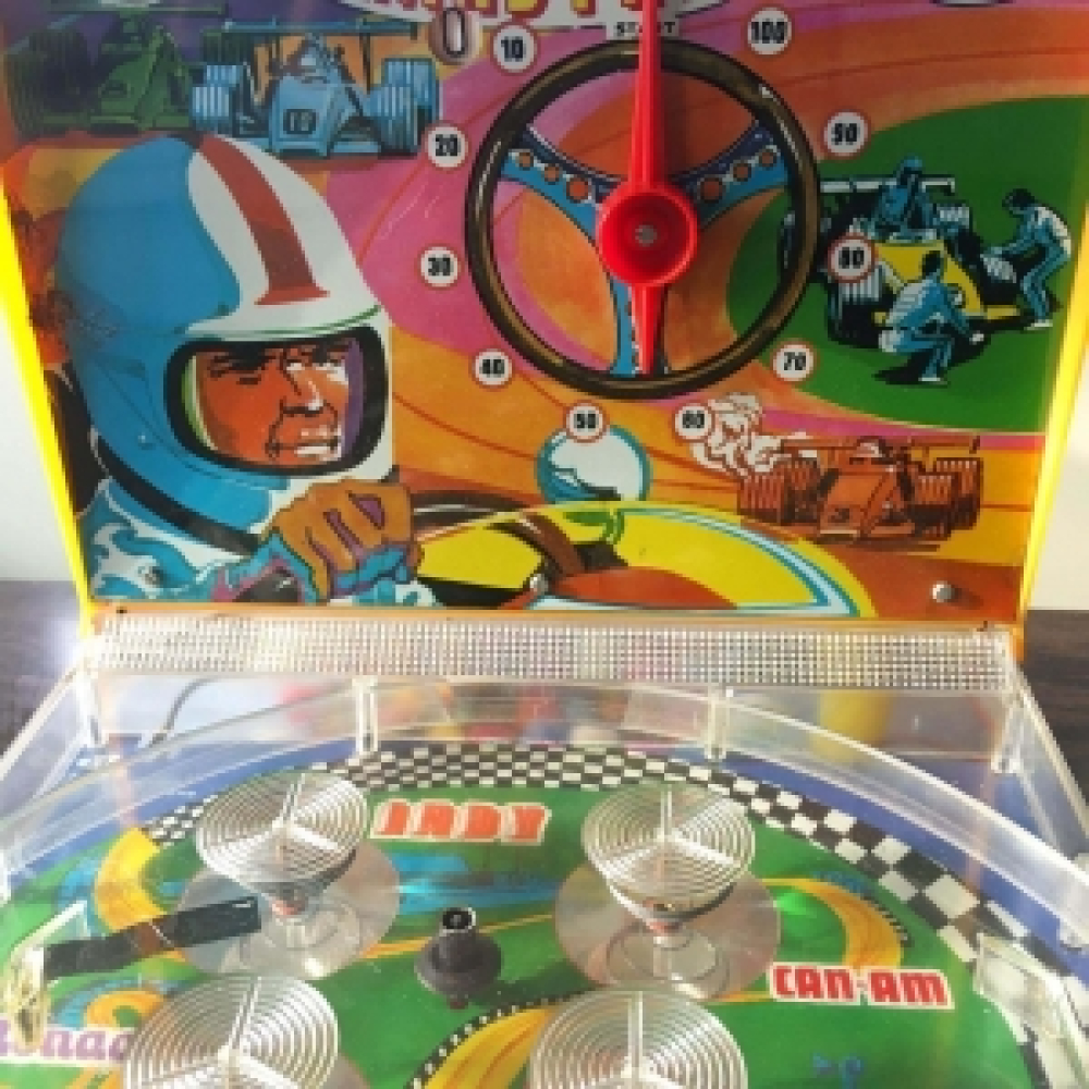 Vintage mini Grand Prix F1 flipperkast. Mooie vintage kunststof tafel-flipperkast van Durham Industries NY uit de jaren 70. Voor iedereen die wel een flipperkast wil, maar geen ruimte heeft voor een echte! Dit exemplaar staat op kleine pootjes en is eenvoudig te gebruiken op de tafel of aanrecht. Deze flipperkast is voor zijn leeftijd in goede staat, helemaal compleet en klaar voor een nieuwe ronde! Je kunt hem voorzien van batterijen zodat de lichtjes en dergelijke werken, maar hij is natuurlijk ook zo te gebruiken. Nagekeken, verstevigd en schoongemaakt is hij nu klaar voor een nieuwe race-liefhebber! De afmetingen van deze flipperkast zijn: breedte 26 cm, lengte 51 cm en hoogte 30 cm.