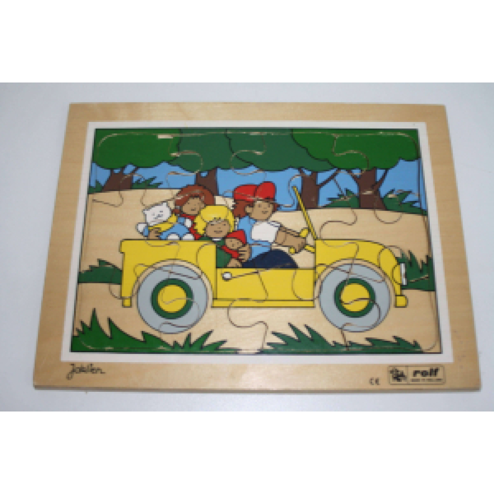 Vintage puzzel met auto. Leuke vintage houten puzzel met auto en blije kinderen van het welbekende merk Rolf. Simpel, met een leuke afbeelding en goed voor uren speelplezier! Goed voor dagen puzzelplezier voor de kleinsten.