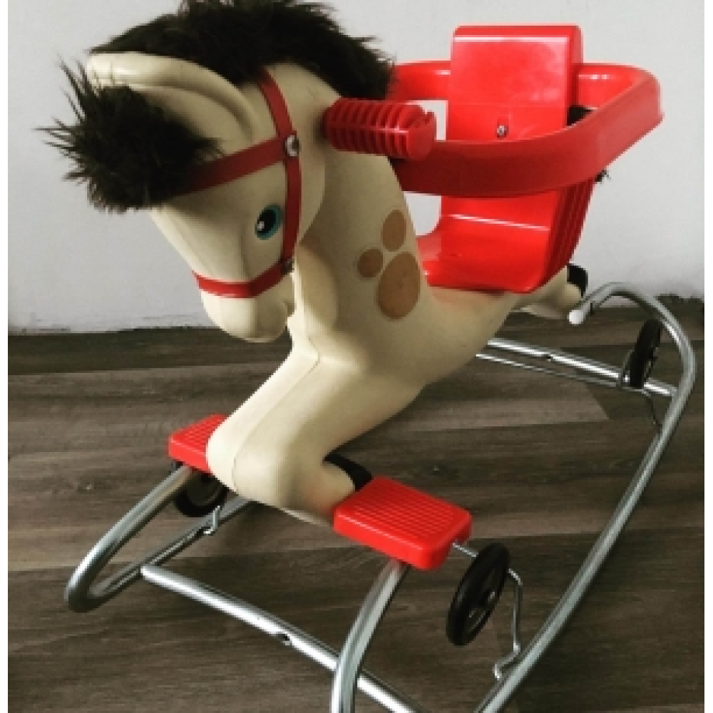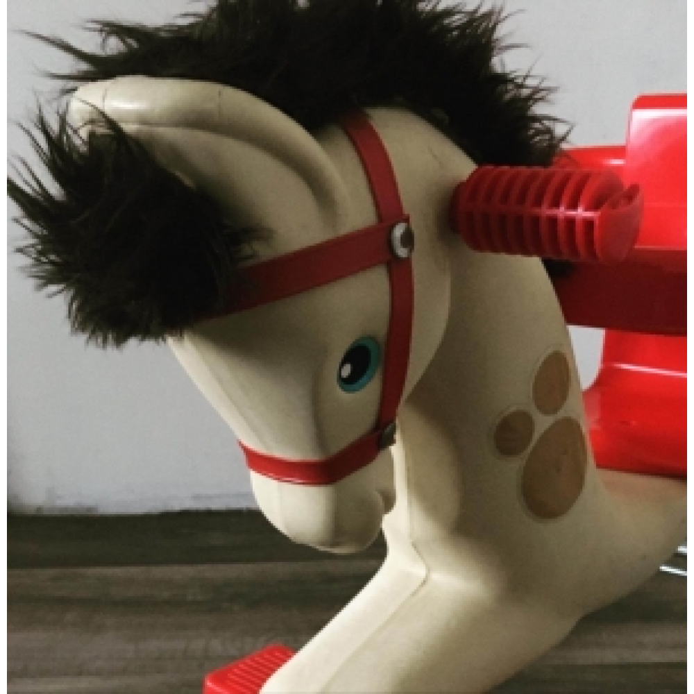 Vintage retro hobbelpaard. Een stoer hobbelpaard uit de eighties, welke in een handomdraai om te toveren is tot een looppaard! Het paardje is van kunststof, met een stevig zitje en voetsteuntjes, en dit steunt op een metalen onderstel met inklapbare wieltjes. Natuurlijk inclusief een trekkoord. Stevig, robuust, leuk, met zachte manen, klaar om weer door een peuter tot leven gewekt te worden! De afmetingen van dit hobbelpaard zijn: hoogte 50 cm, de lengte is 46 cm en de breedte is 20 cm. De zithoogte is 30 cm. Ben je op zoek naar een hobbelpaard van een maat groter? Kijk dan eens bij Vintage industrieel hobbelpaard nr 143