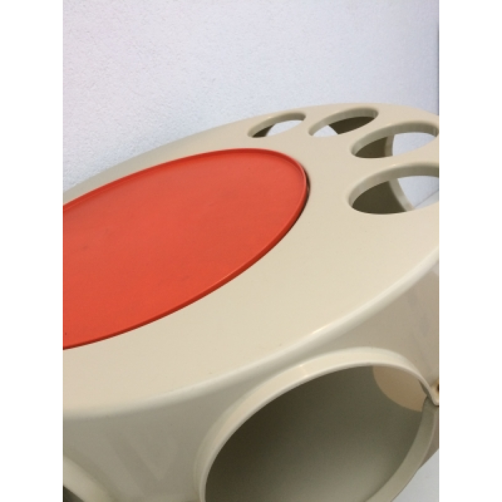 Vintage Rotobar wit nr 118. Een design-icoon uit de 60's, de Curver rotobar! Mooi vintage tafeltje van wit kunststof met bovenop een oranje dienblad, met een kenmerkende vorm en een prachtige uitstraling. Met een uitsparing bovenop op voor het dienblad, uitsparingen voor flessen aan de bovenkant en ronde gaten om eventueel tijdschriften in op te bergen. Voorzien van een metalen poot en zwenkwieltjes, in goede vintage staat. Vintage design uit de space-age!