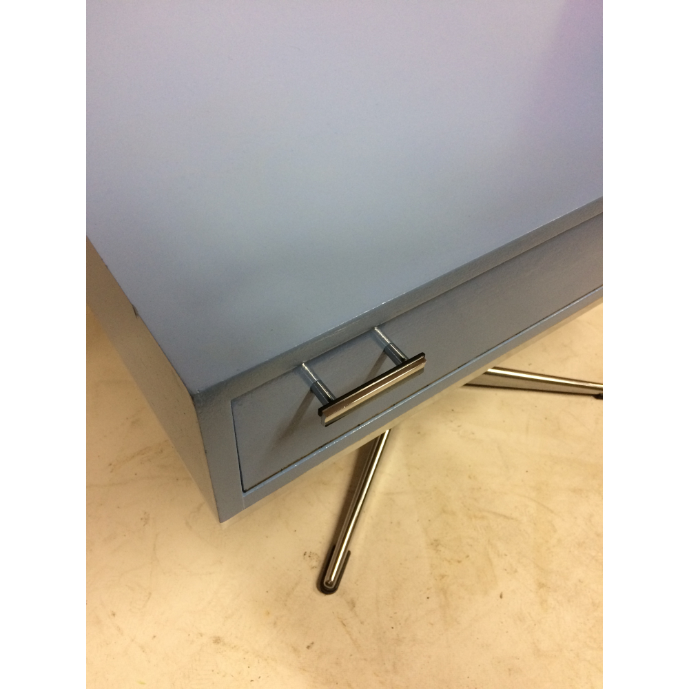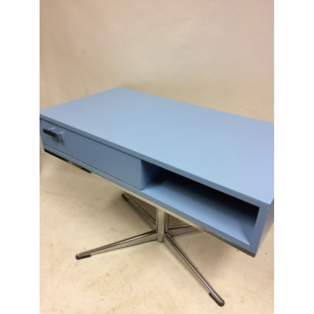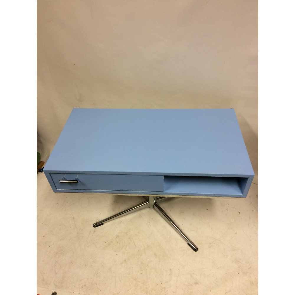 Vintage seventies kastje. Dit mooie seventies kastje hebben we weer opgeknapt en voorzien van een mooi babyblauw kleurtje. Het kastje is van hout, één gedeelte is voorzien van een klepje met een mooi handgreepje, en het geheel is voorzien van een mooie chromen poot. Mooi voor op de kinderkamer (hij is draaibaar!) of natuurlijk in de huiskamer!