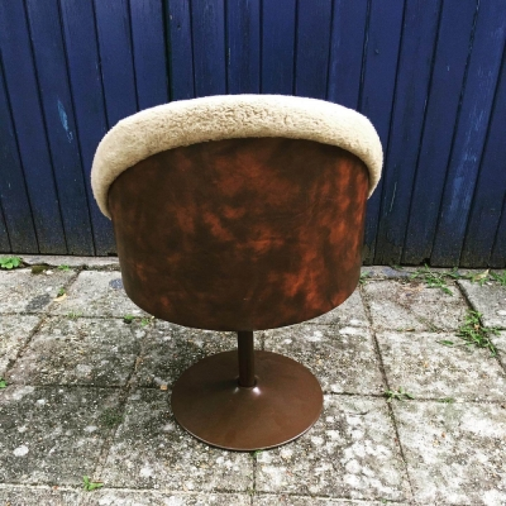 Vintage seventies stoel. Mooi stevig vintage stoeltje uit de jaren 70 in goede conditie, aan de buitenkant voorzien van skaileer en aan de rand en bovenkant natuurlijk afgewerkt met muppetskin. De bruine metalen trompetvoet maakt het af! Mooi origineel stoeltje in goede staat, klaar voor een nieuwe ronde. Leuk voor bijvoorbeeld in de huiskamer, kinderkamer of speelhoek. Zithoogte 40 cm. Groovy!