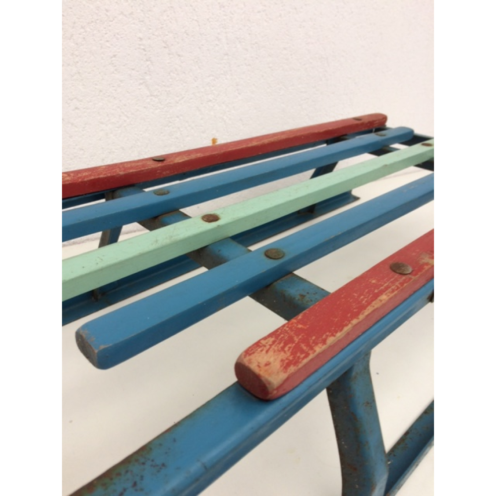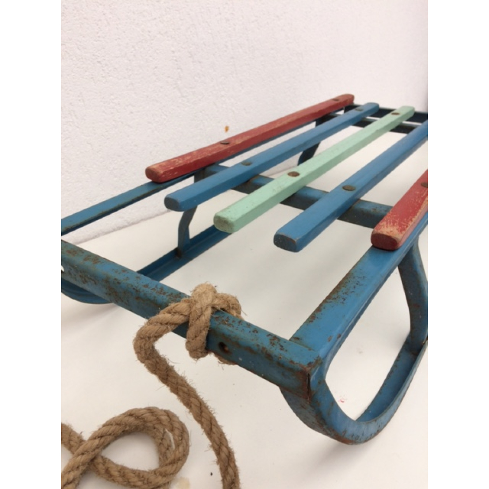 Vintage slee. Kleurige vintage slee met een metalen frame en houten latjes uit de jaren 70. Die heb je straks weer nodig!