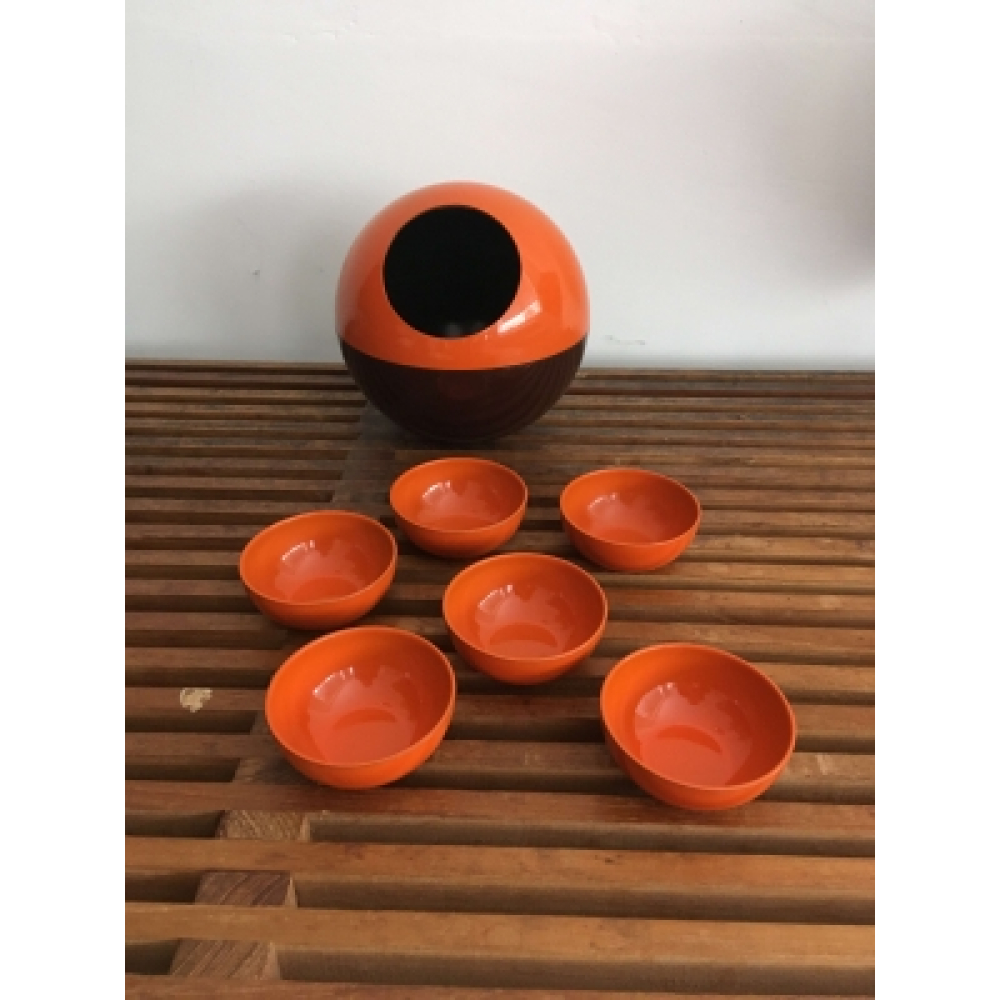 Vintage snack bowl uit de 70s. Mooie snack bowl (of pic bowl, of pinda bowl) in goede staat in een bruin met oranje kleur. Deze bol is uitstekend geschikt om te vullen met pinda's of andere snacks, en deze vervolgens op een feestje uit te serveren op een van de zes schaaltjes. Groovy!!!!