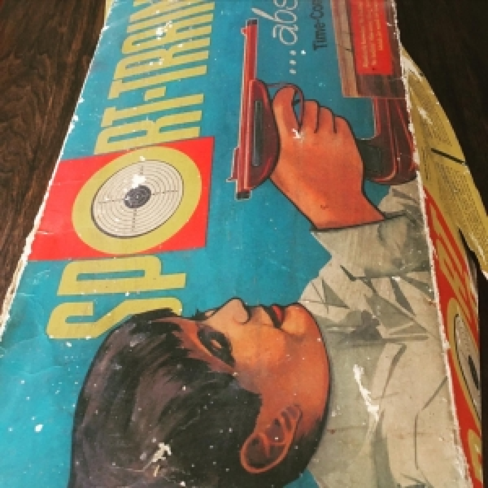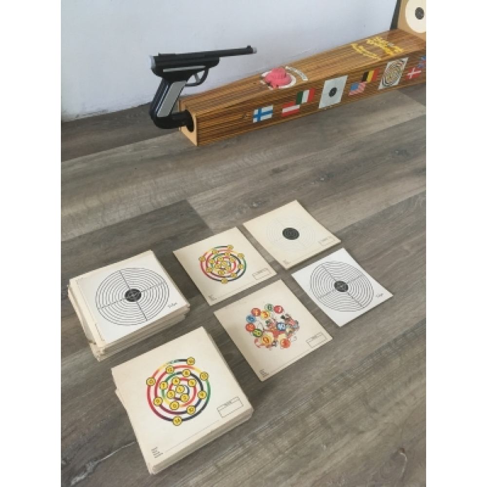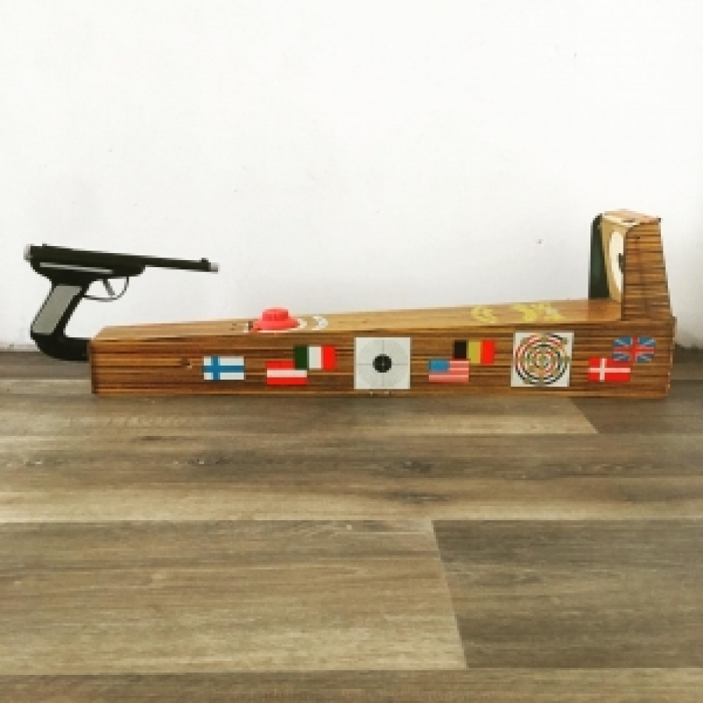 Vintage Technofix sport-trainer uit de jaren 60! Mooi vintage schietspel uit de jaren 60, helemaal van blik, in goede staat en klaar voor een nieuwe ronde. Deze sport-trainer zit nog in de originele doos, is voorzien van een extra stapel targets, een pistool en een timer. De afmetingen van dit vintage schietspel zijn: de lengte is 80 cm, de hoogte 23 cm en de breedte 13 cm.