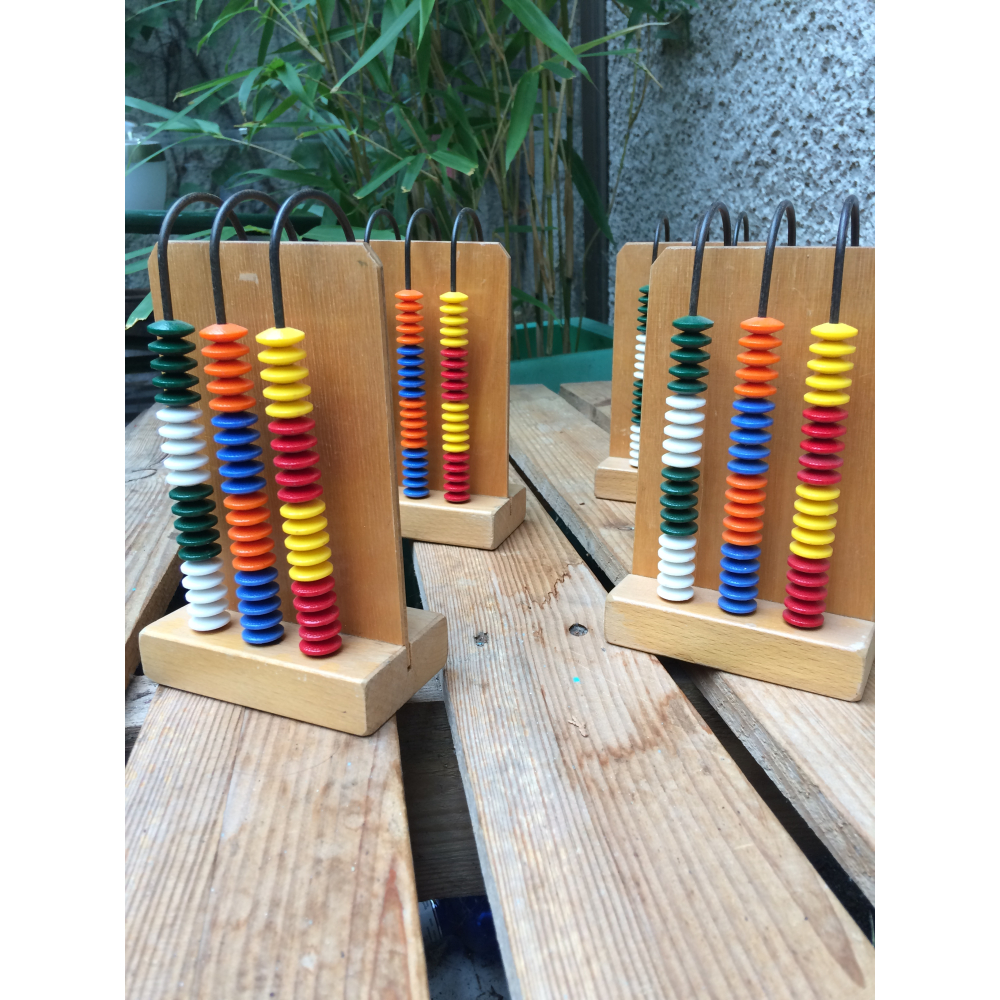 Vintage telraam uit de basisschool. Uit een oude basisschool, vintage abacussen! Mooie abacus met een houten voetje, ijzeren ringetjes en gekleurde kraaltjes, om uren mee te spelen, en natuurlijk om mee te leren rekenen. Natuurlijk ook mooi om als decoratie op een bureautje op de baby- of kinderkamer neer te zetten. De hoogte is 14 cm, het voetje is 6 bij 4 cm.